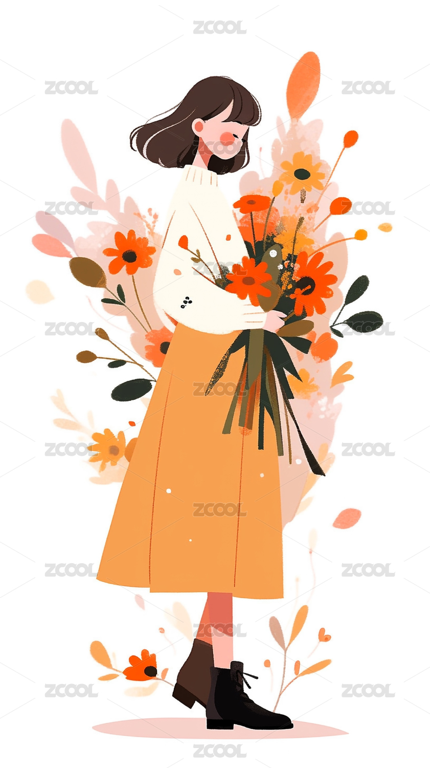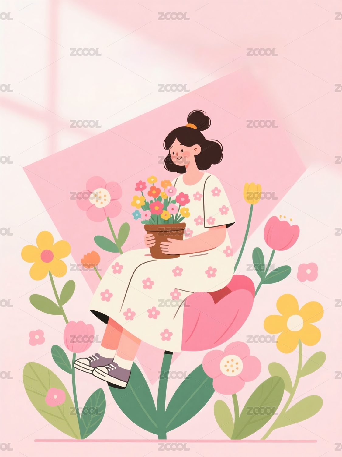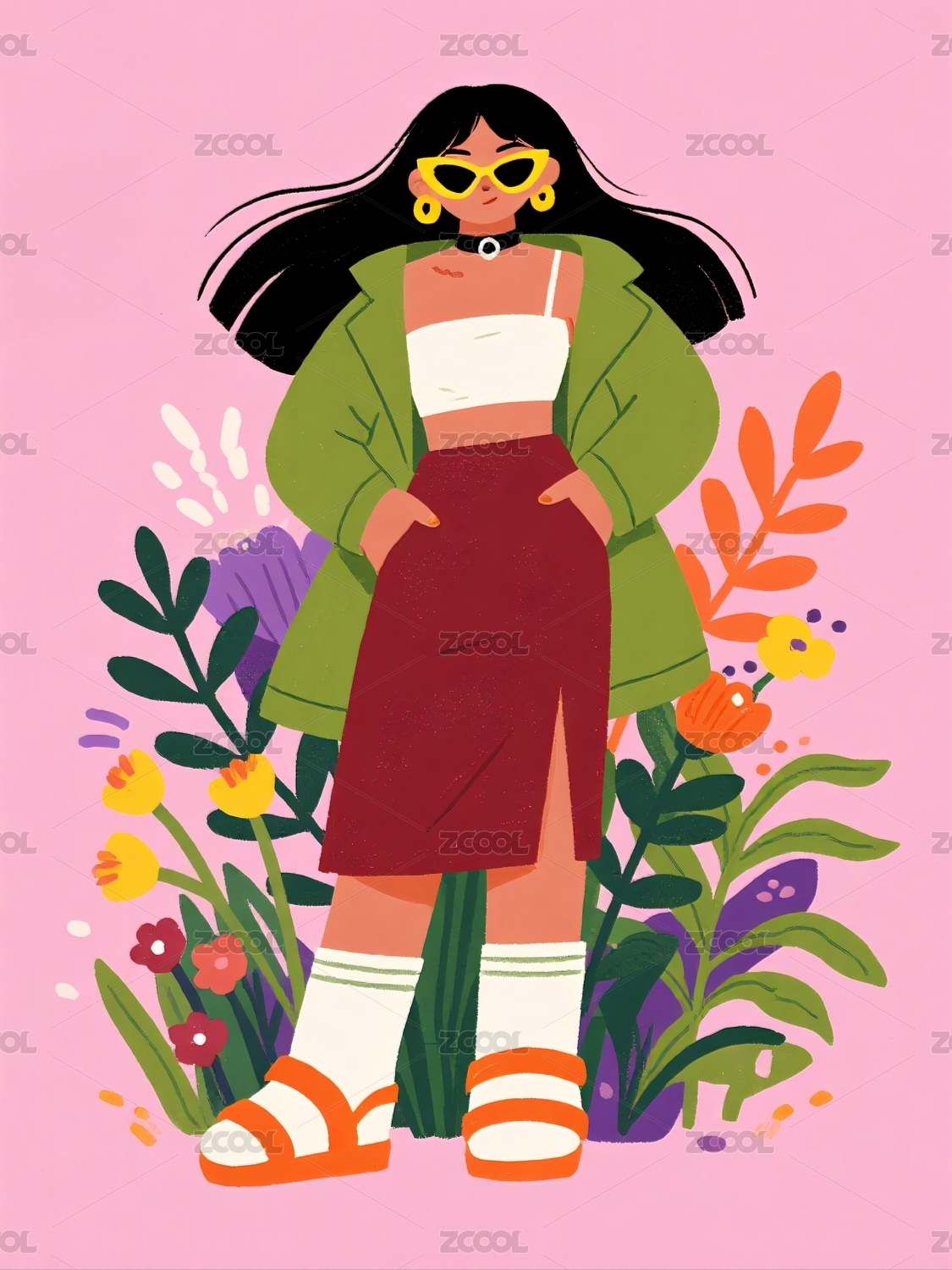 红色长裙,白色上衣,背景粉色,艺术插画,插画风格,休闲风格,色彩搭配,时尚女子,蓝色鞋子,蓝色包包
