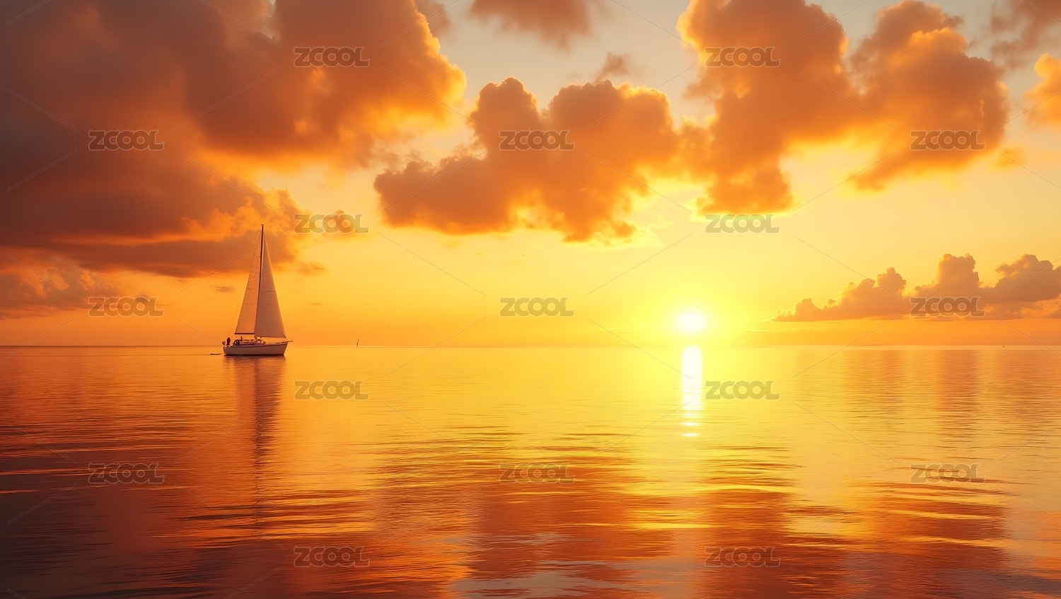 航拍视角下日落晚霞大海中航行的一艘帆船