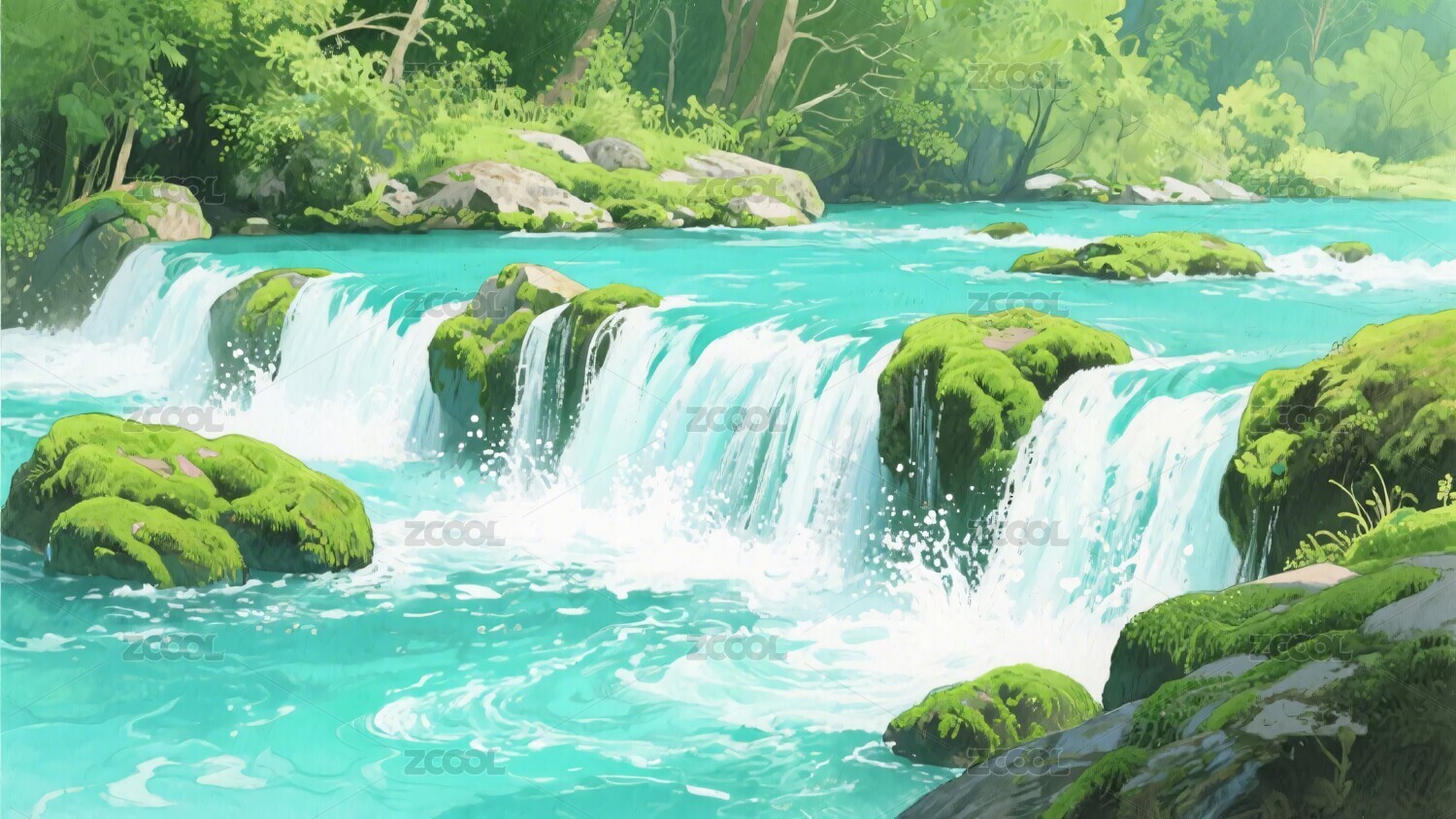 溪流,石头,绿植,插画,自然,风景,流水,瀑布,森林,清新