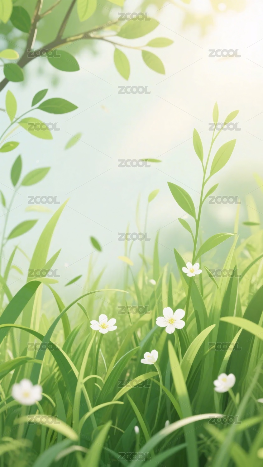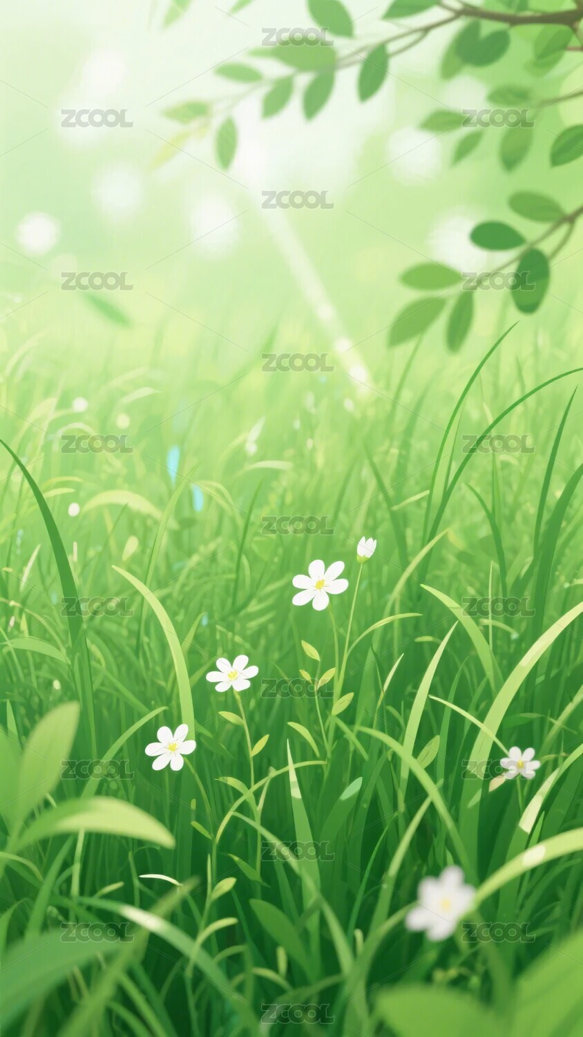 草地,小花,阳光,树叶,自然,清新,风景,插画,矢量,绿色