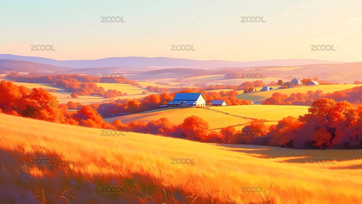 田野,茅草屋,大树,秋日,风景,插画,矢量,自然,天空,麦田