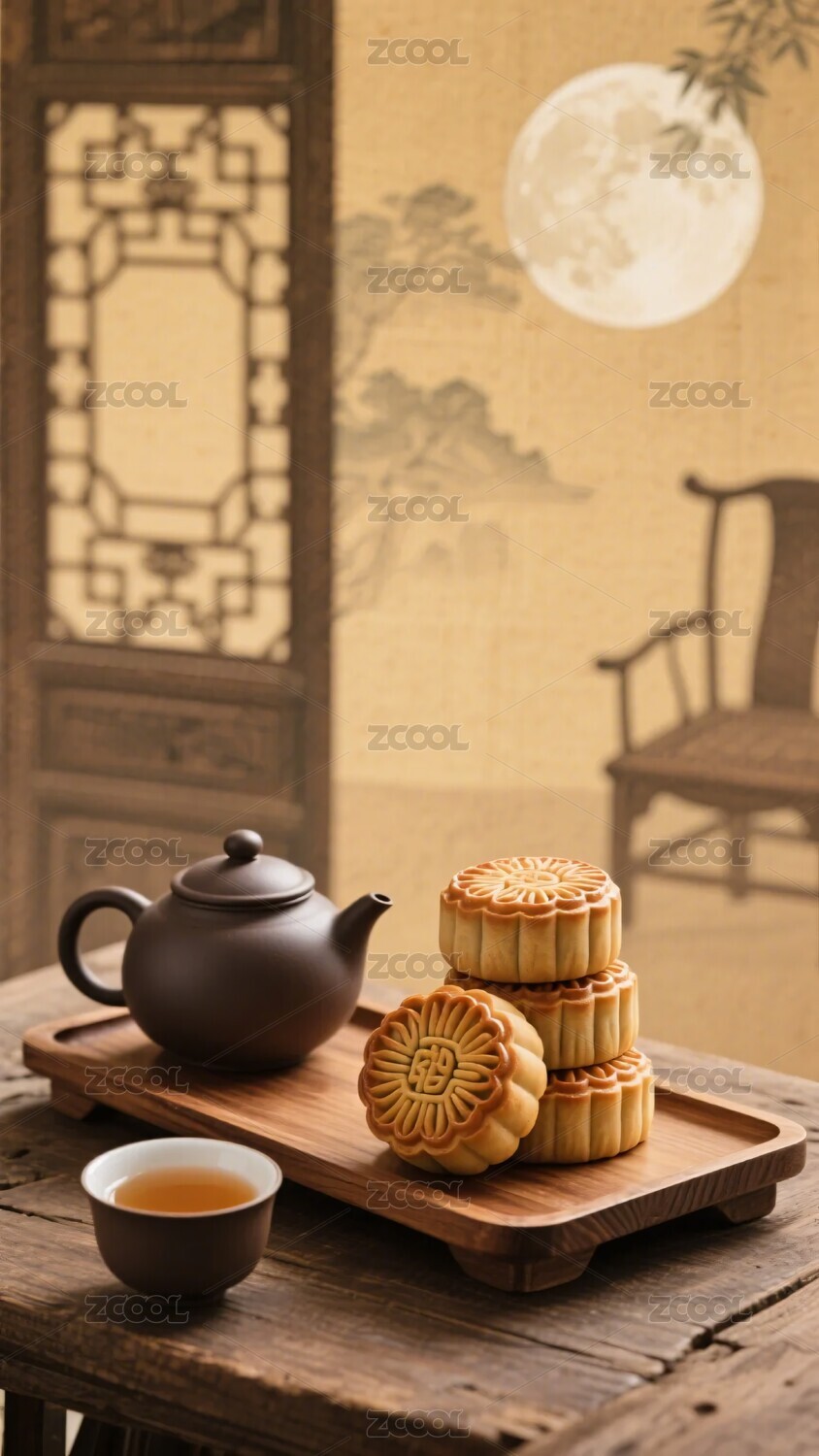 中式茶具与月饼的中秋场景