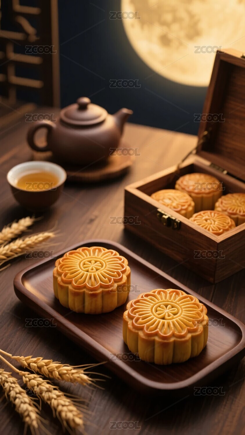 月饼,茶壶,茶杯,糕点盒,麦穗,月亮,中式,传统,美食,中秋