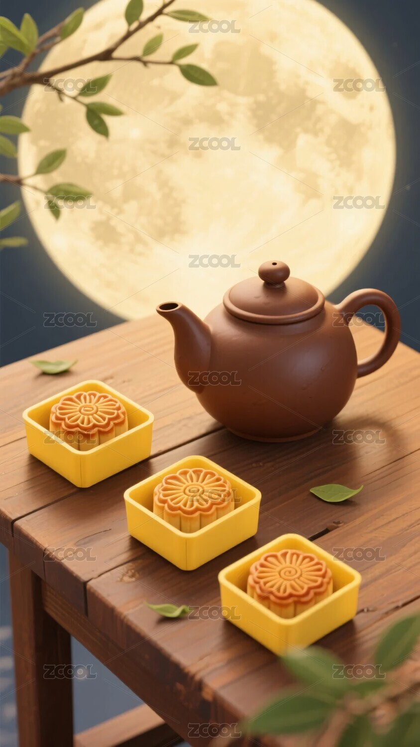 中秋元素之月饼茶壶与月景