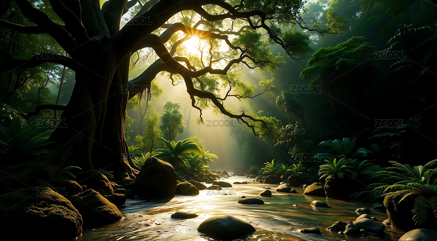 阳光穿透丛林绿意盎然神秘而宁静的自然风光