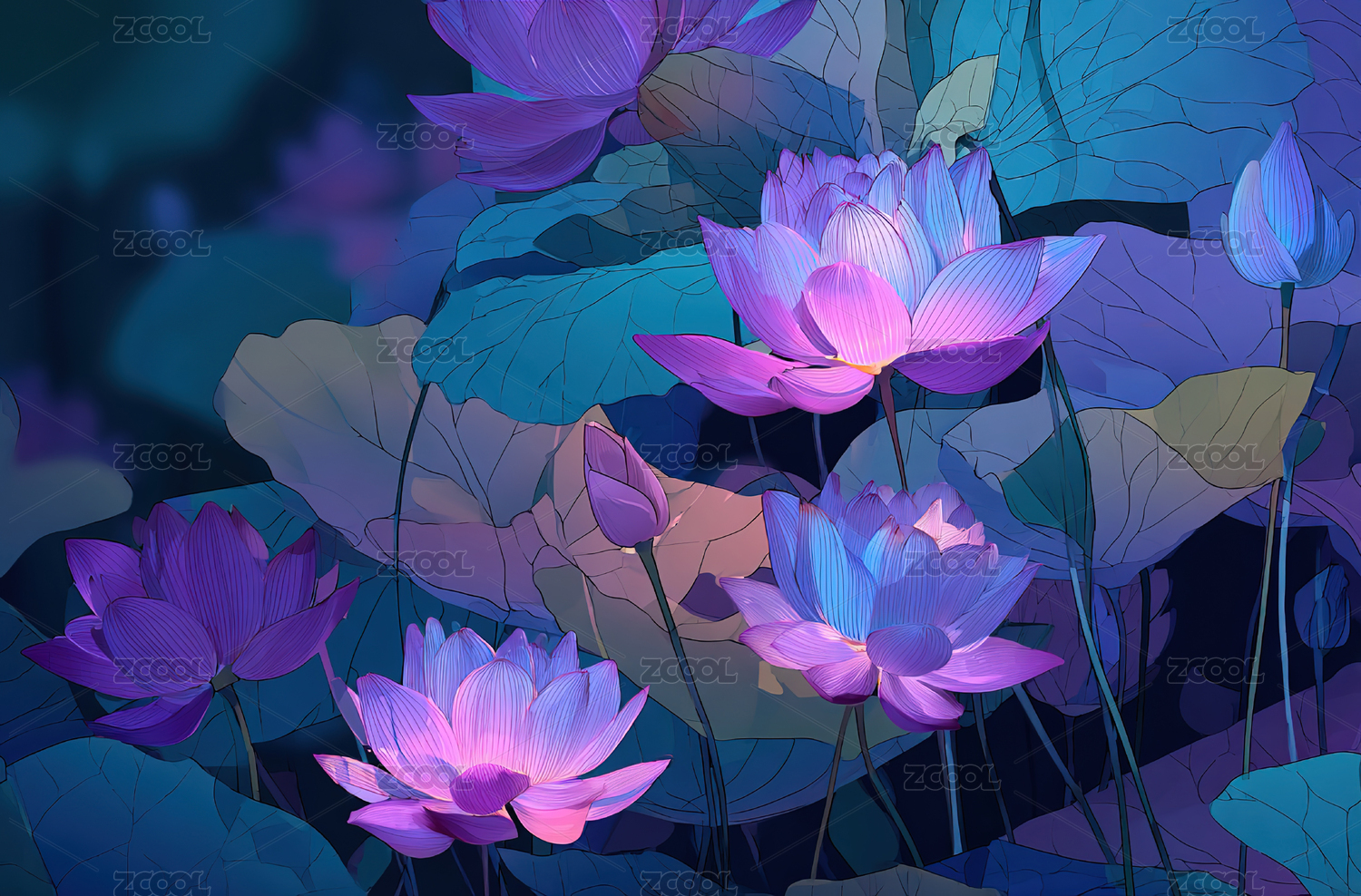 魔法发光睡莲在水塘中美丽盛开的特写插图