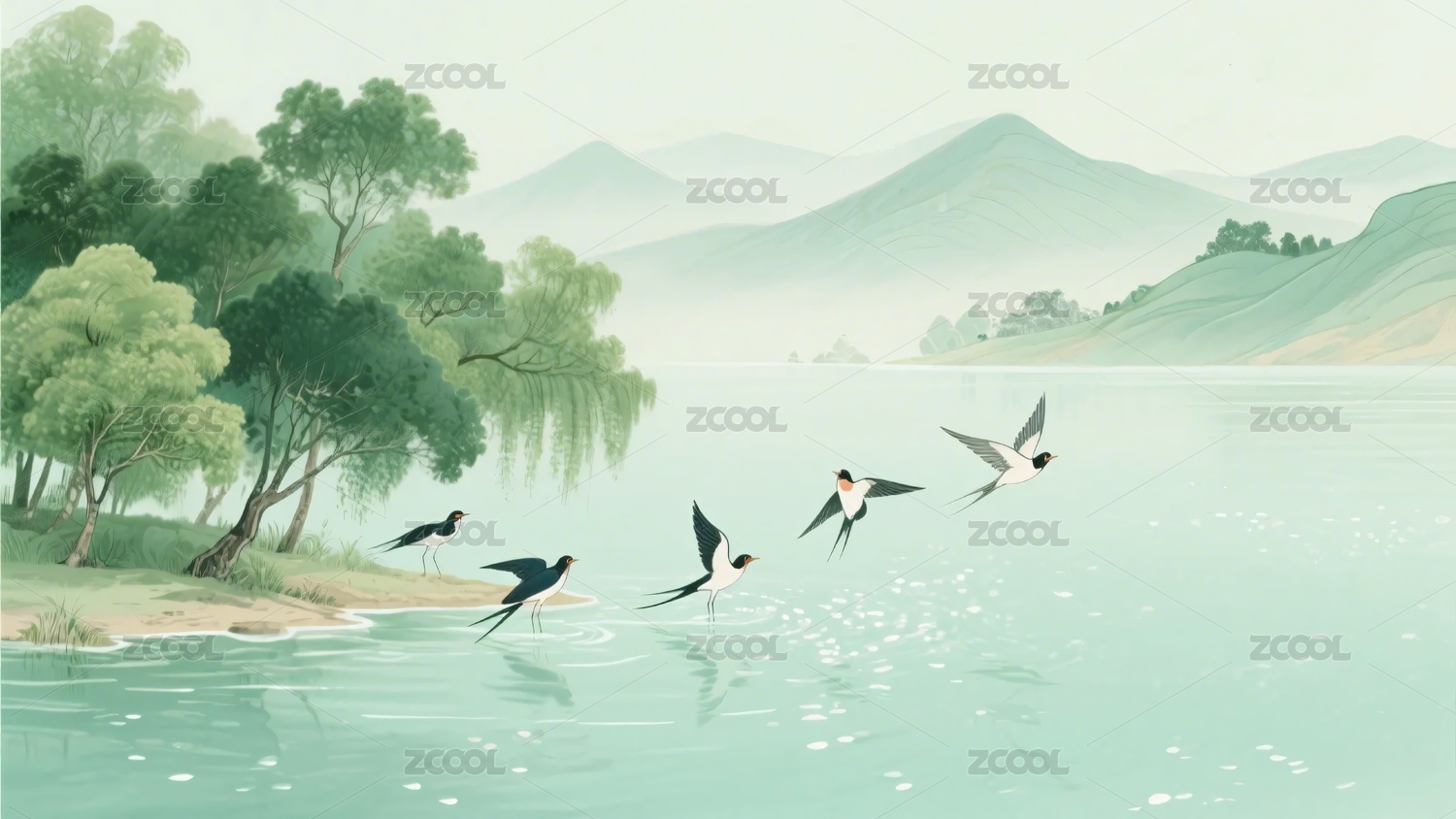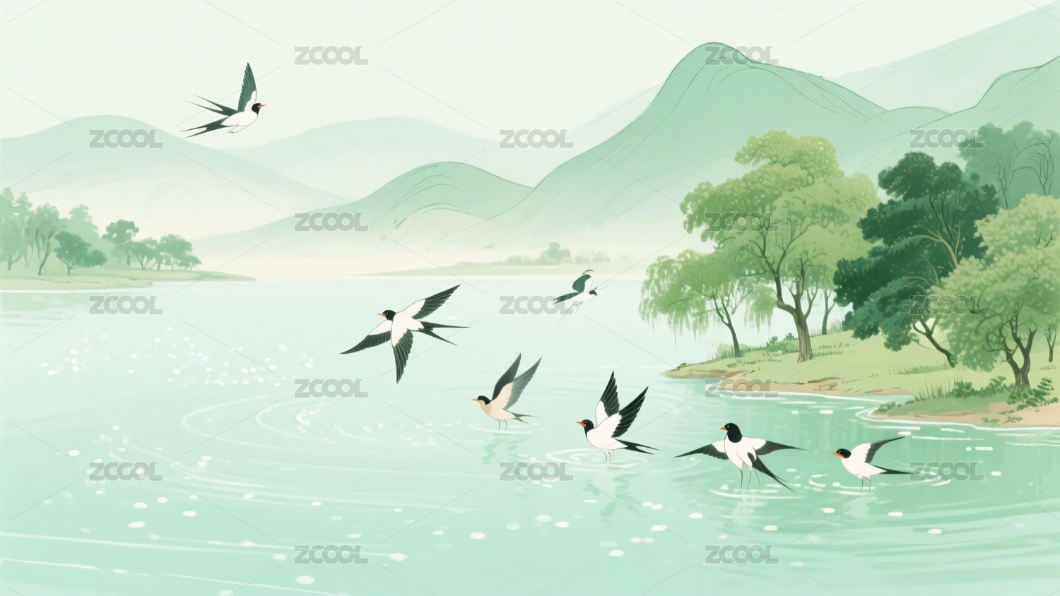 湖畔群燕飞翔山水美景
