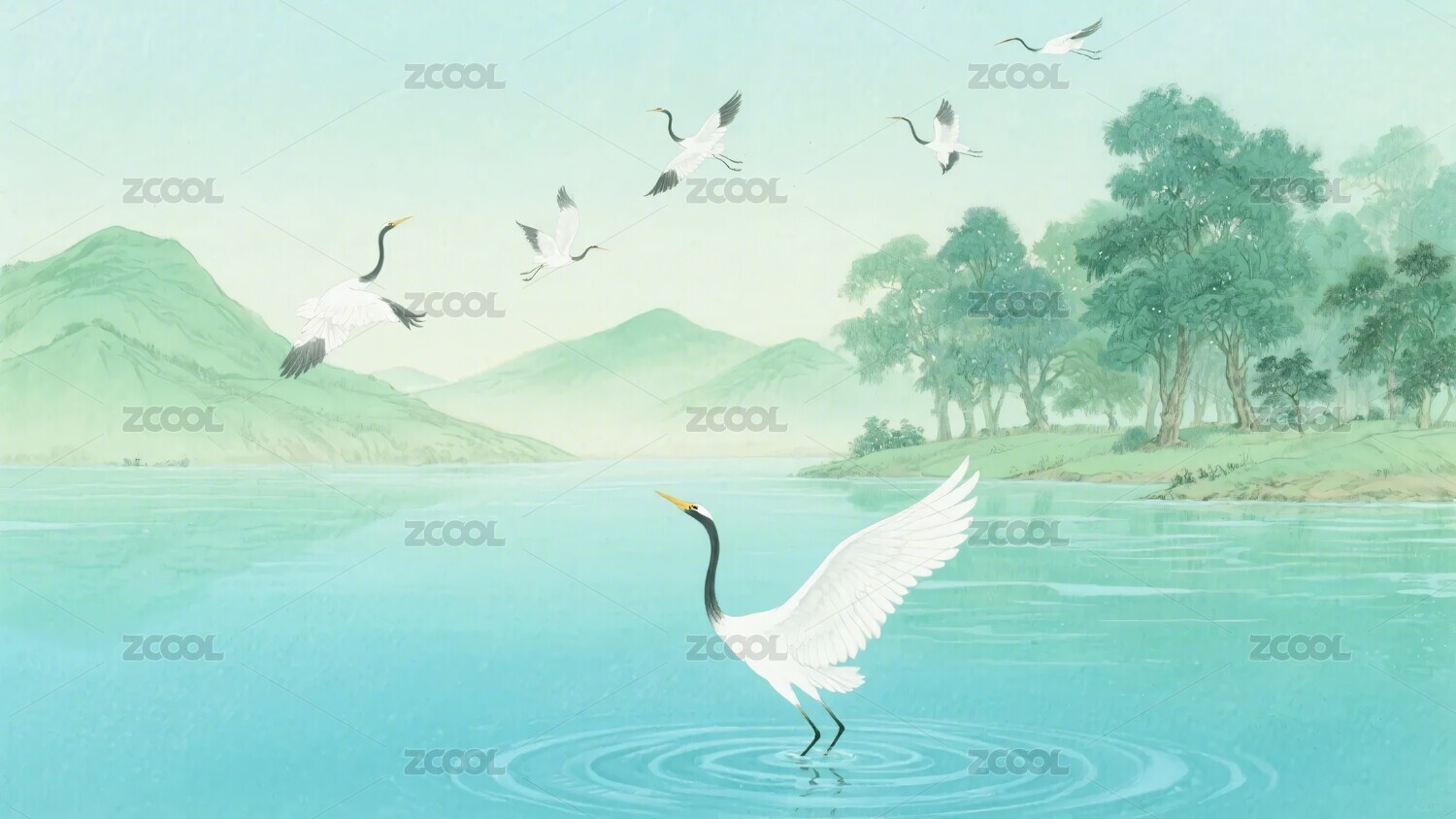 山水间群鹤飞翔图景
