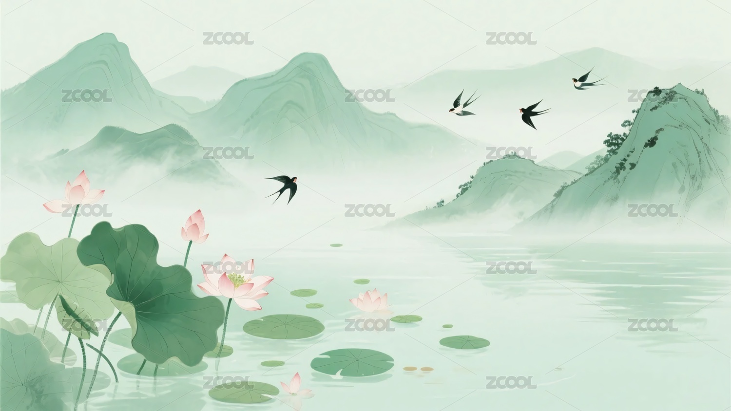 水墨风山水荷花飞鸟景致