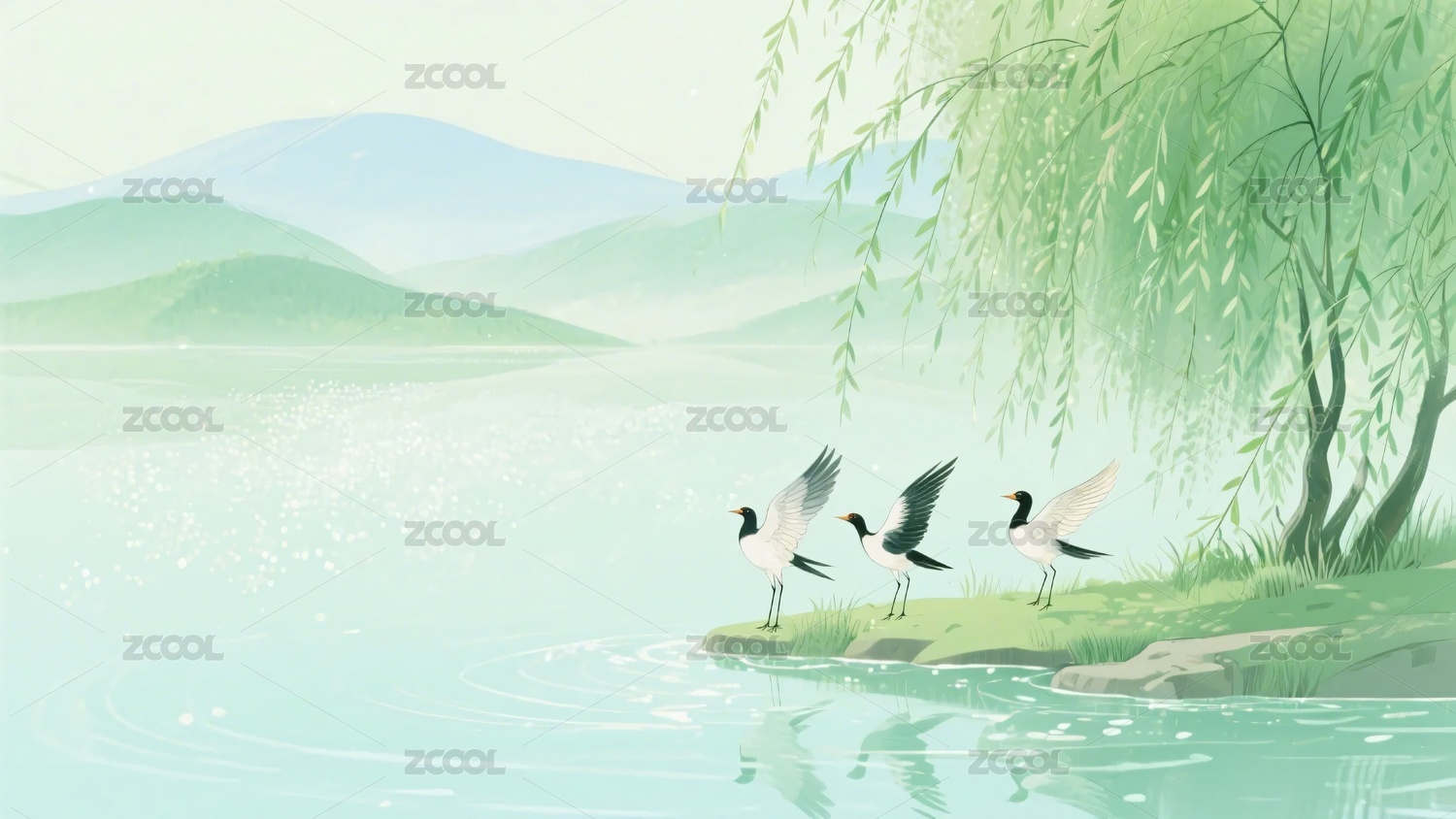 飞鸟,柳树,插画,自然,风景,山水,画面元素,主题,矢量,模板