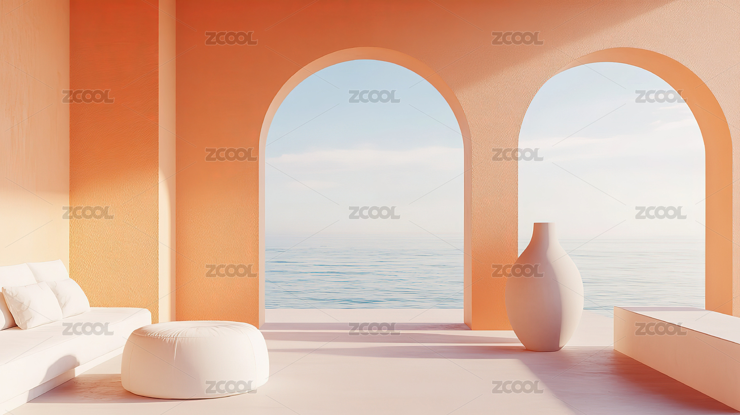 蓝色,客厅,沙发,拱门,海景,植物,地毯,现代,简约,装饰