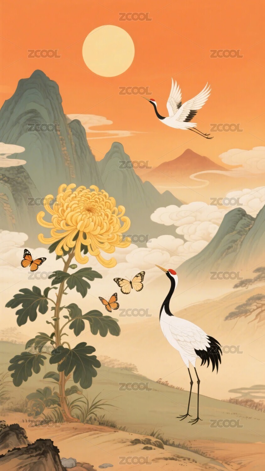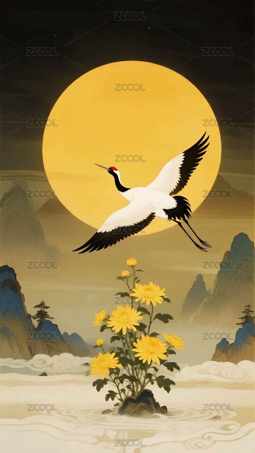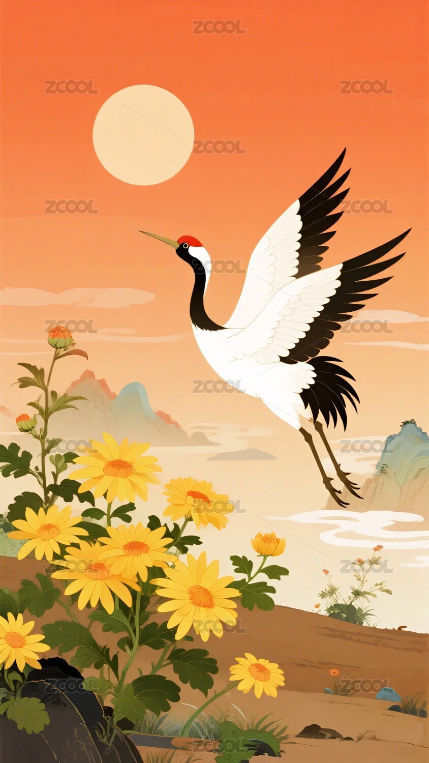 飞鹤,太阳,田野,菊花,山水,插画,风景,自然,元素,天空