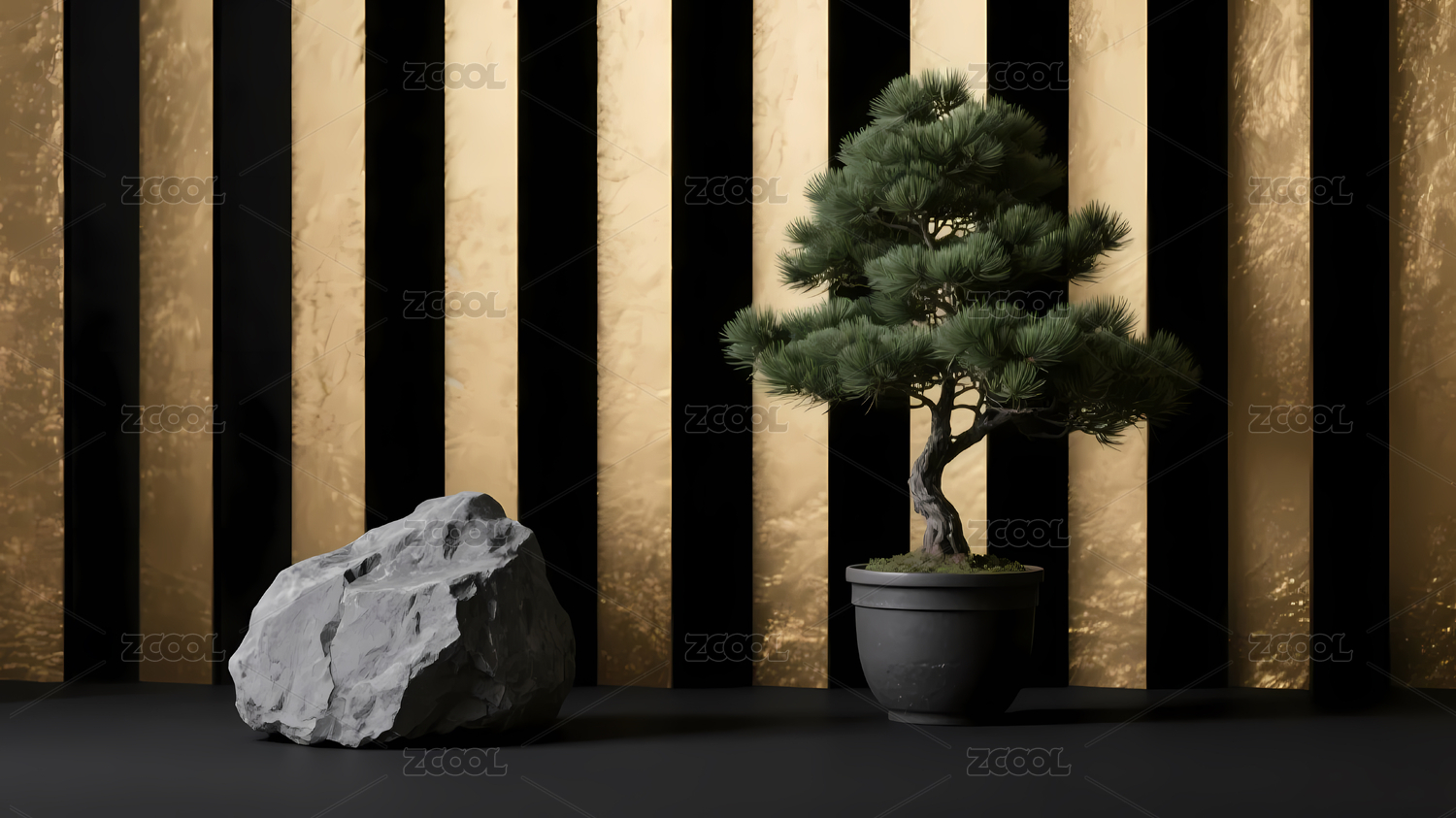 背景,深色,宁静,金色,松树,盆栽,石头,墙面,竖条纹,简约