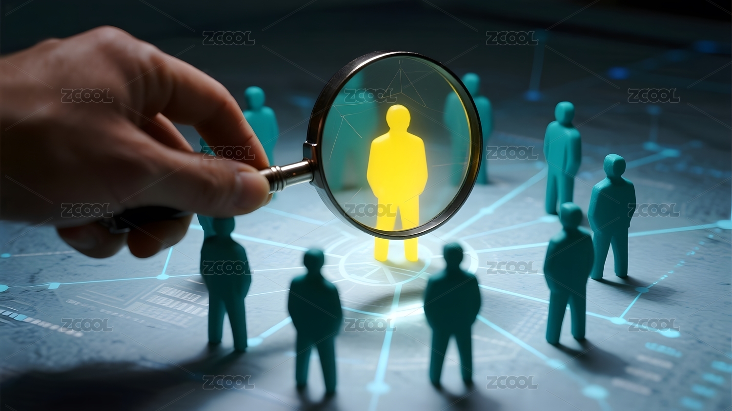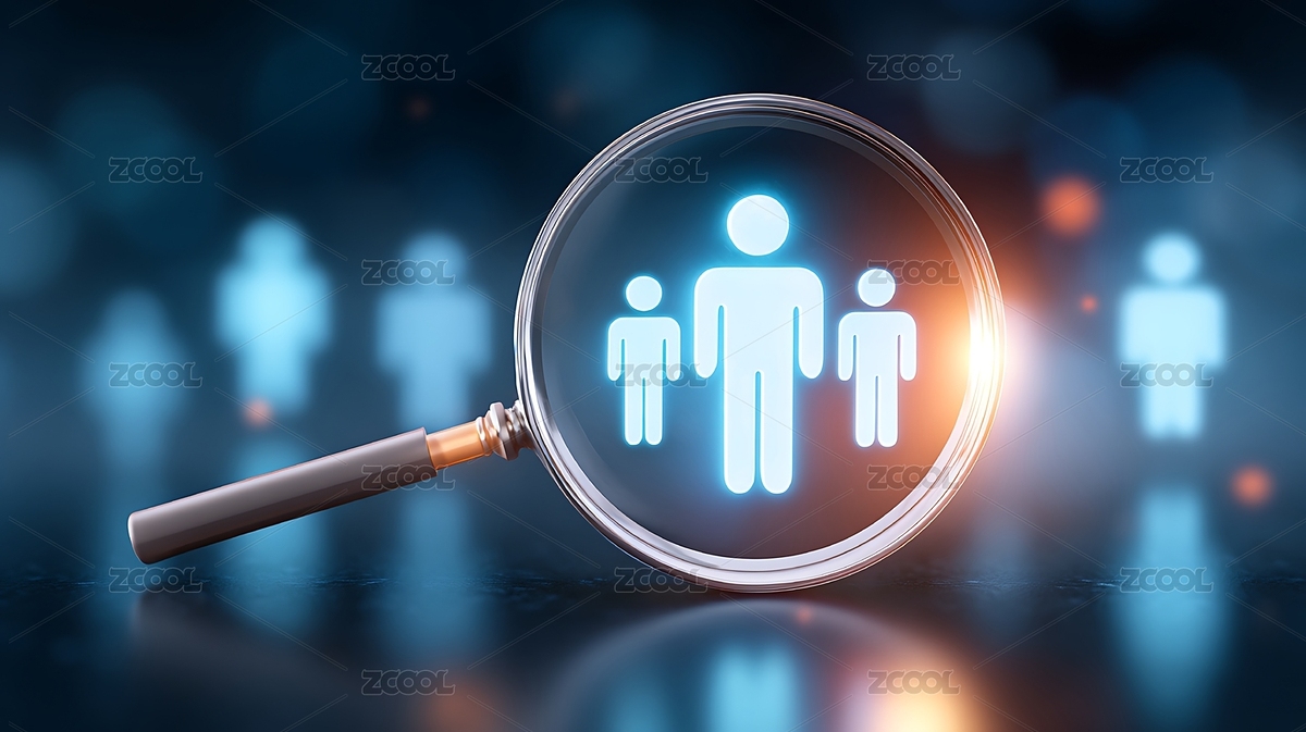 放大镜聚焦人群中的单个人形图标
