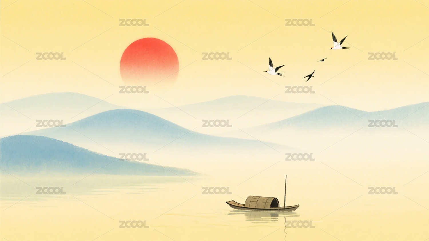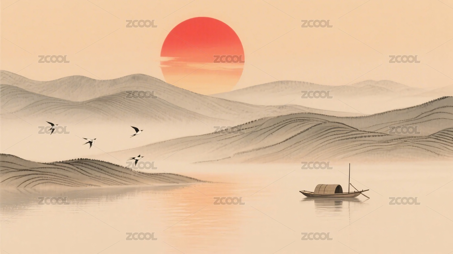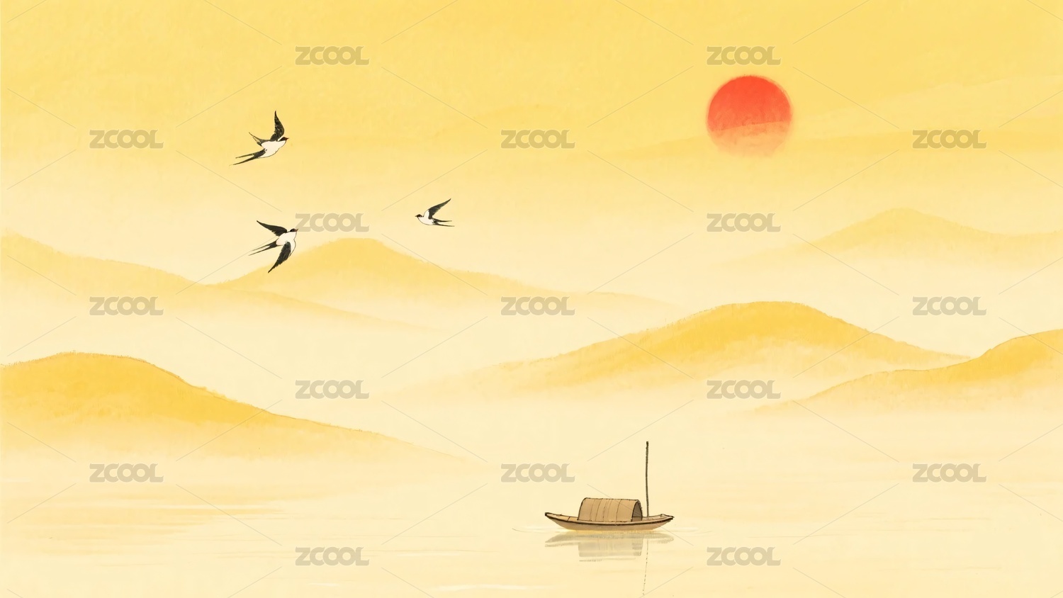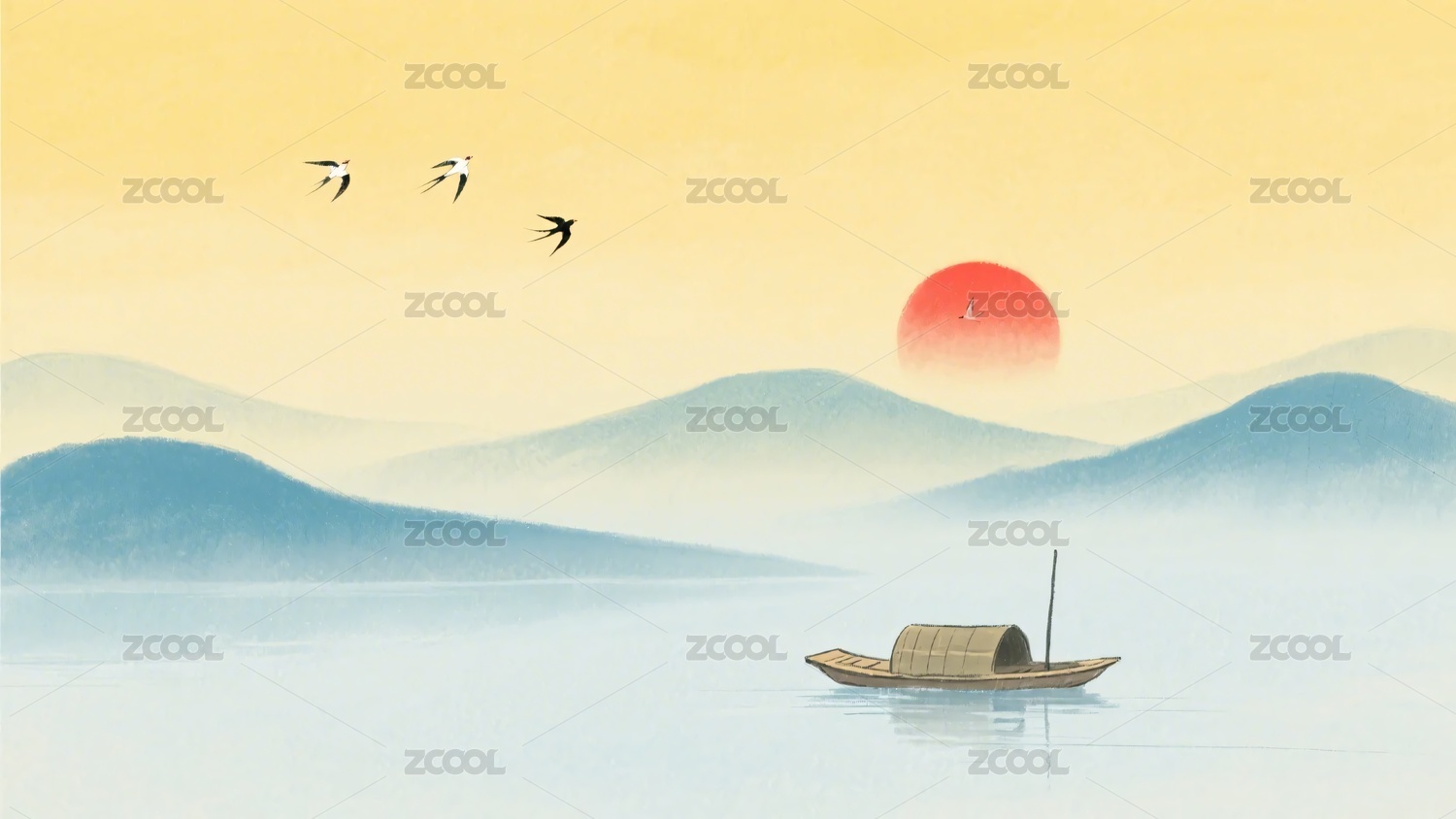 山水,落日,孤舟,飞鸟,自然,风景,插画,意境,静谧,唯美