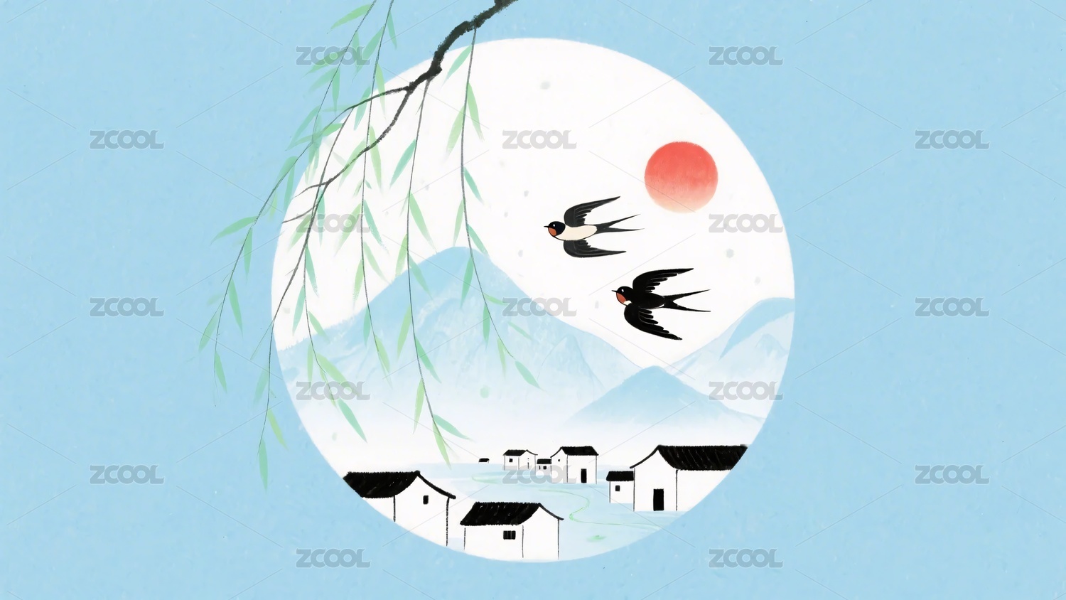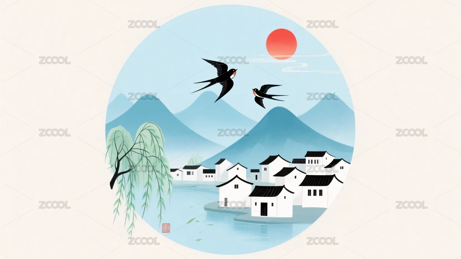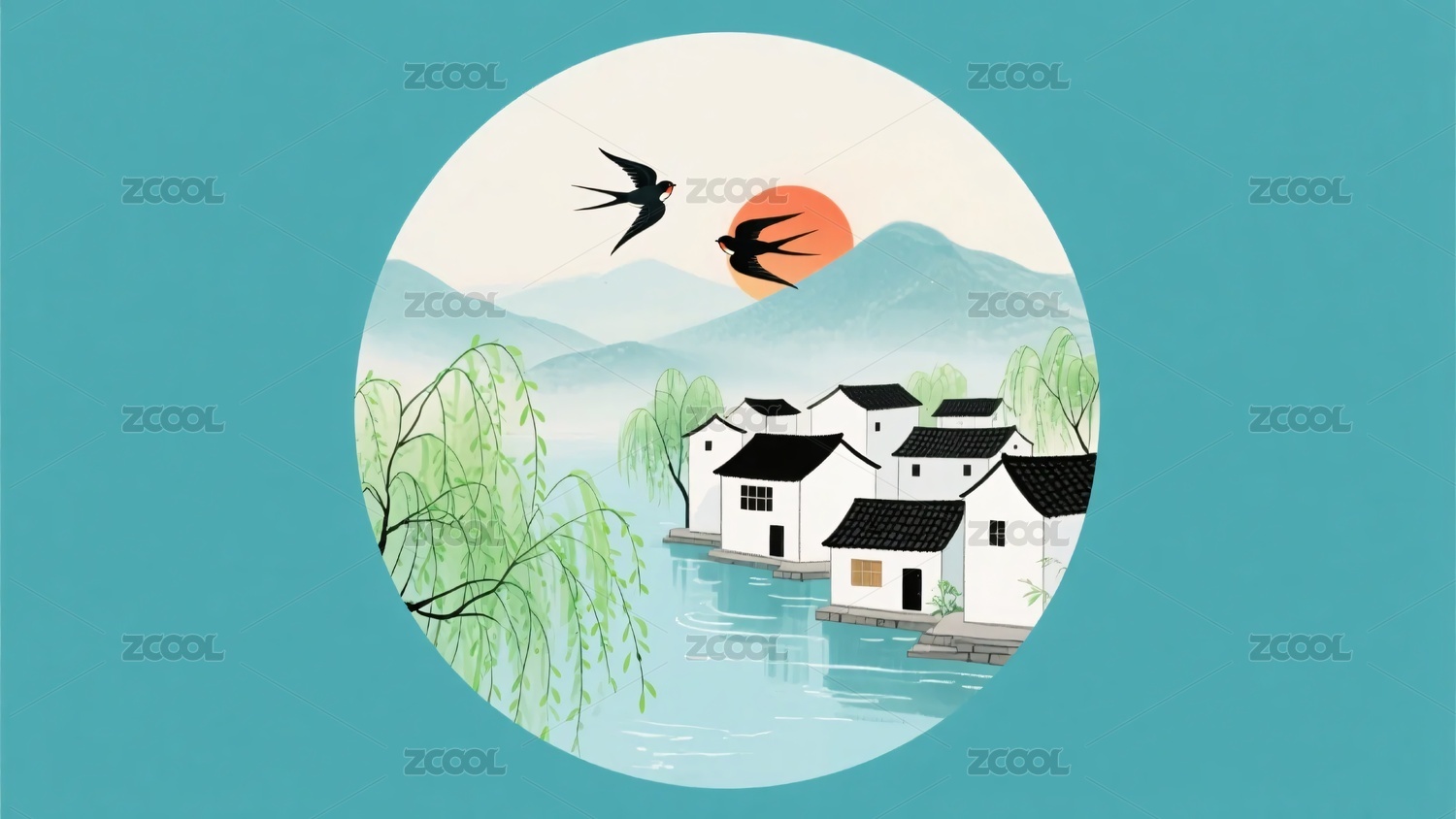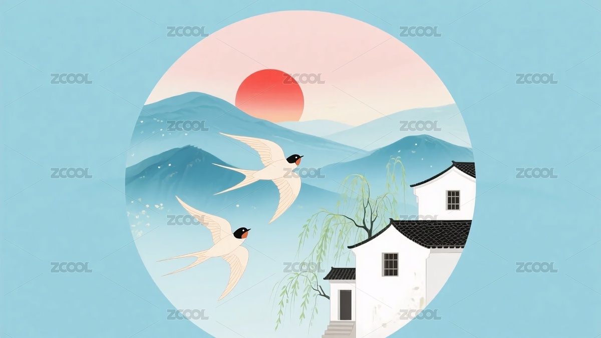 山水,飞鸟,房屋,落日,插画,矢量,风景,中式,自然,圆形