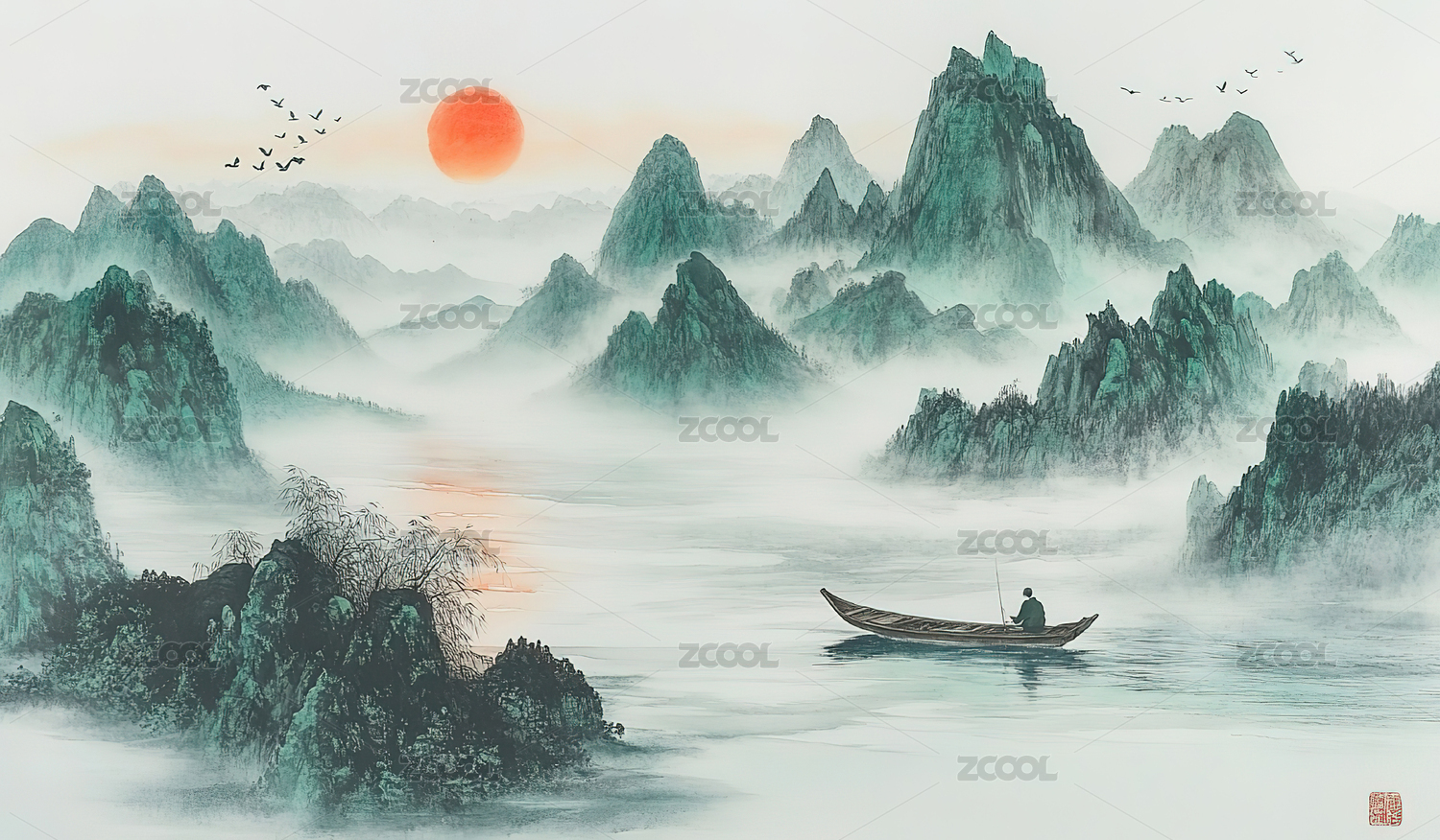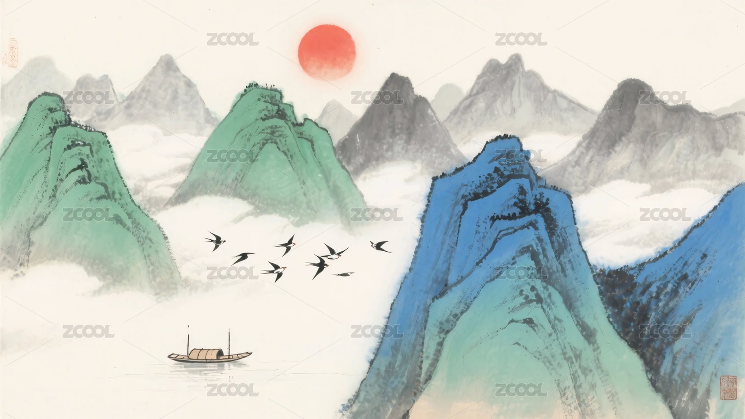 山水,飞鸟,红日,云雾,国画,插画,自然,风景,水墨画,意境