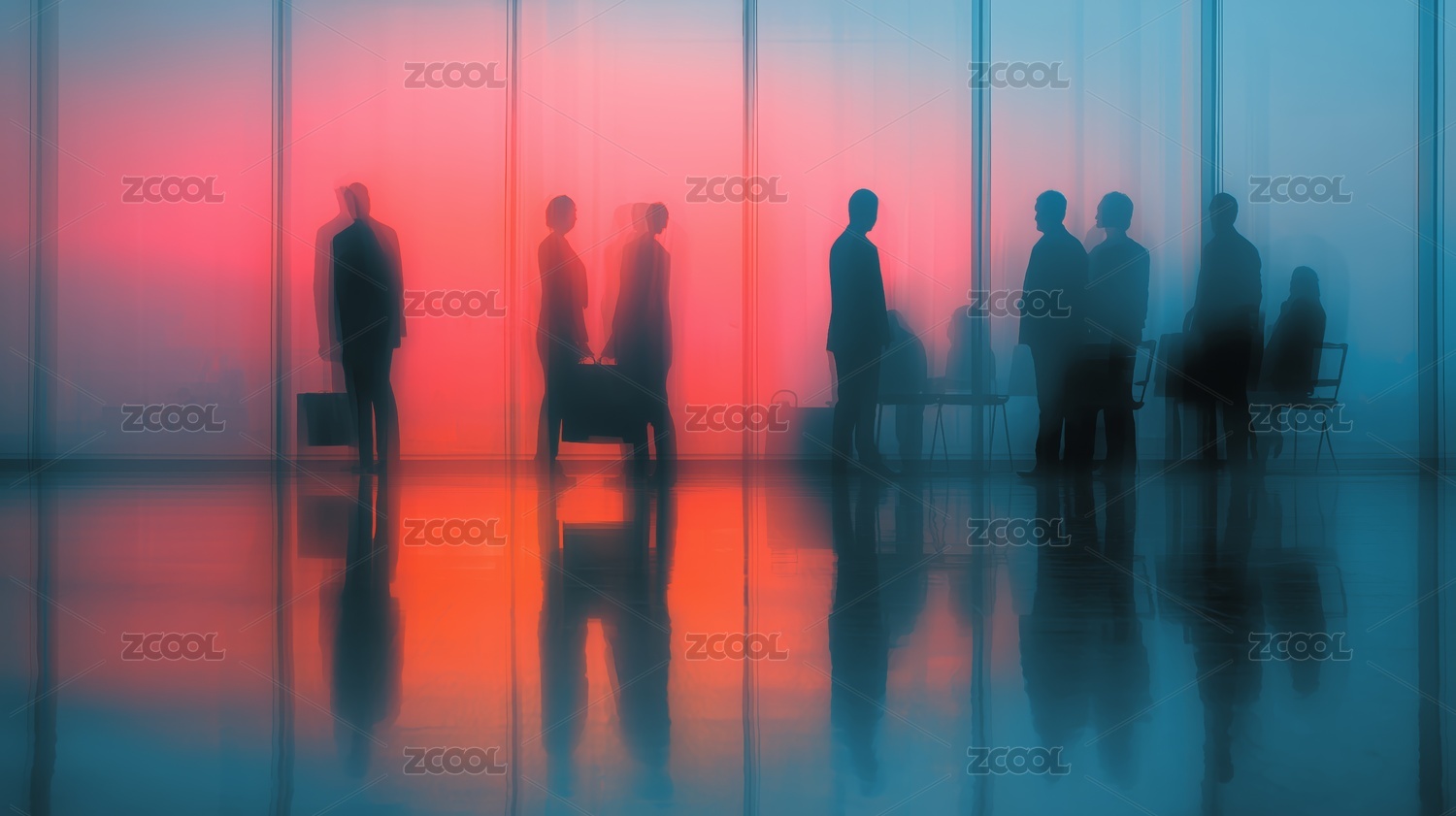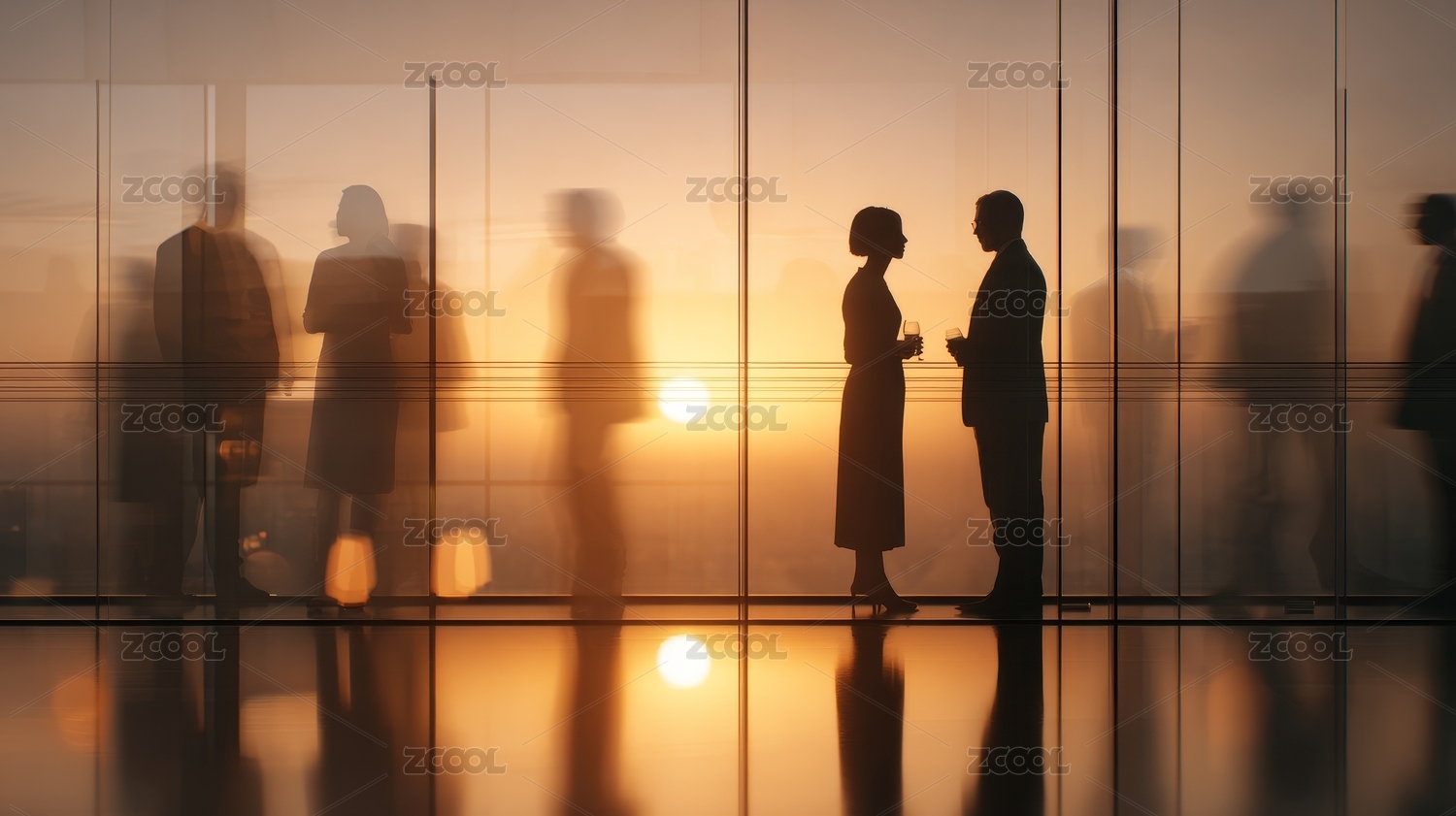 办公室内夕阳下的商务人士剪影