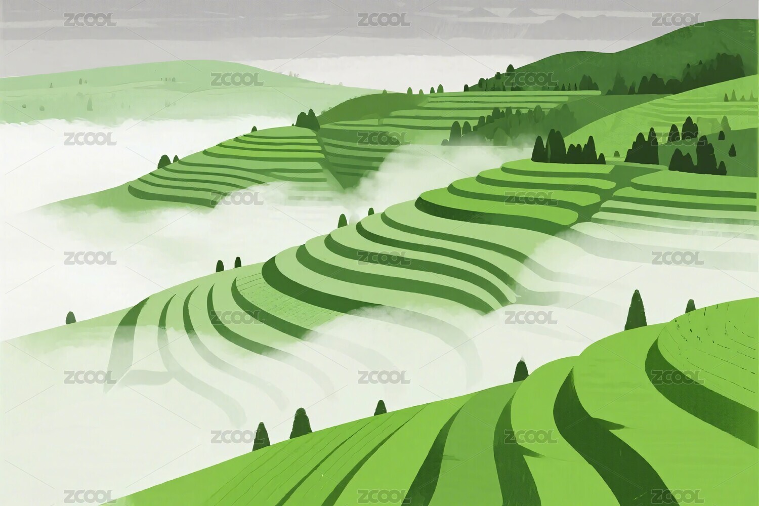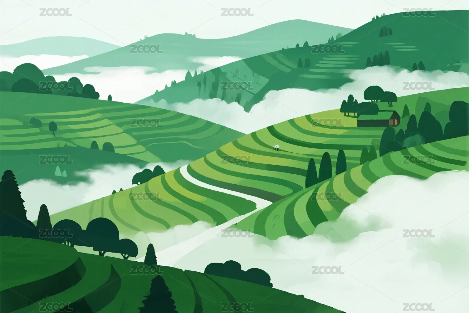 山丘,田野,小路,树木,插画,风景,矢量,绿色,田园,自然