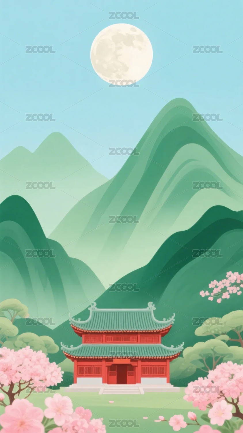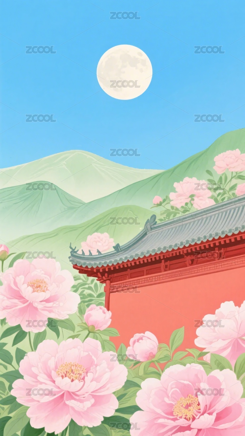 古风建筑,牡丹,月亮,插画,风景,中式,花卉,矢量,背景,自然