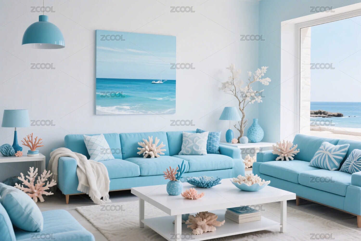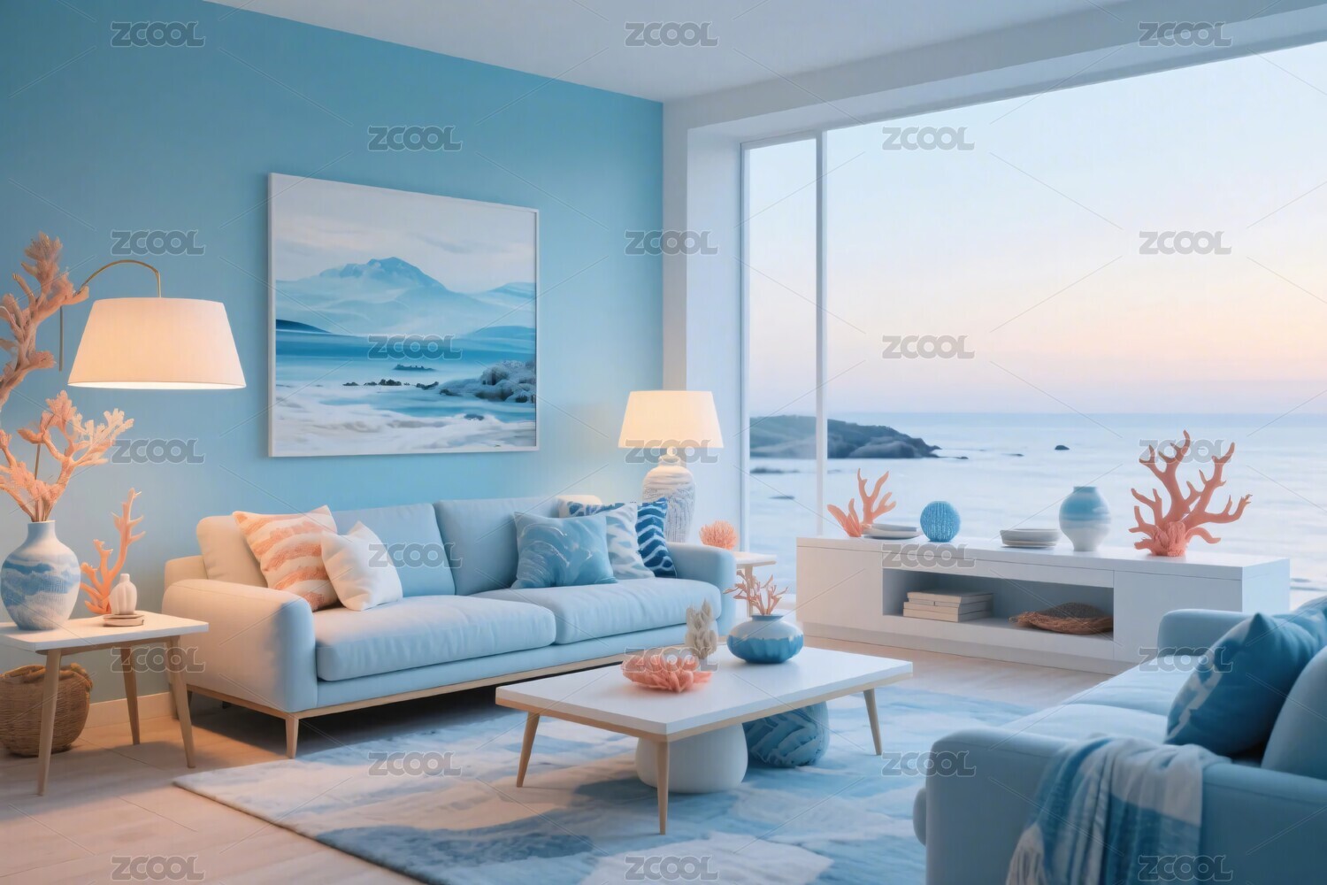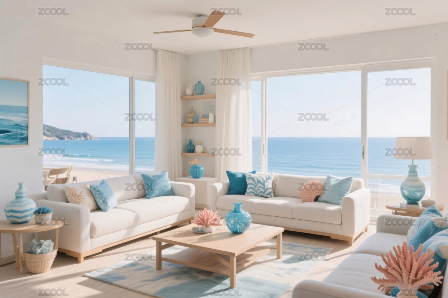 客厅,沙发,茶几,挂画,抱枕,落地窗,海景,装饰摆件,室内,家居