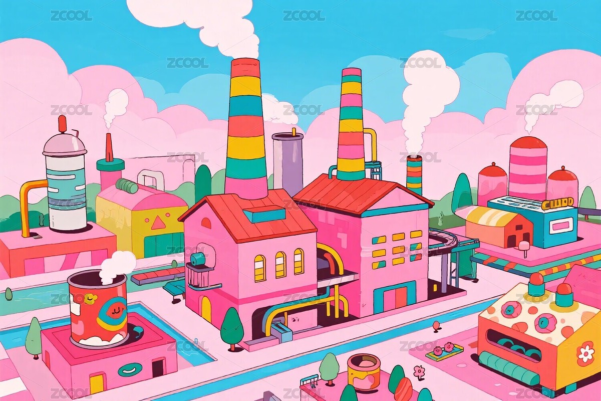 工厂,建筑,烟囱,管道,卡通,插画,彩色,场景,元素,童趣