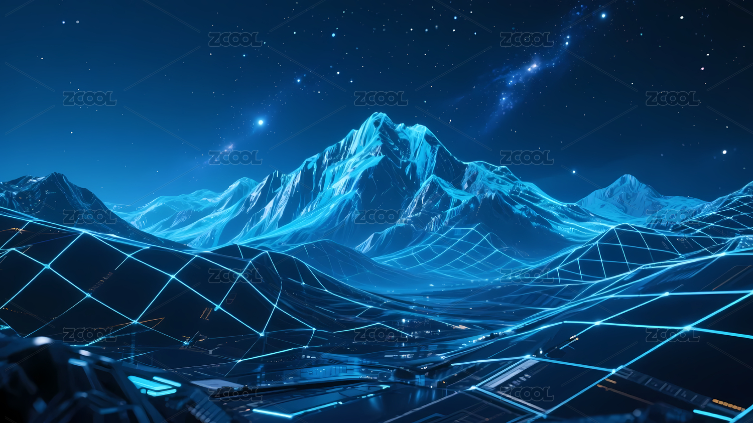 冰雪山脉与光网交织的未来景观