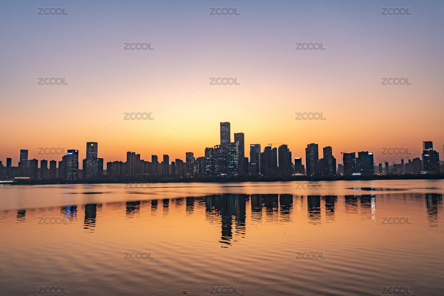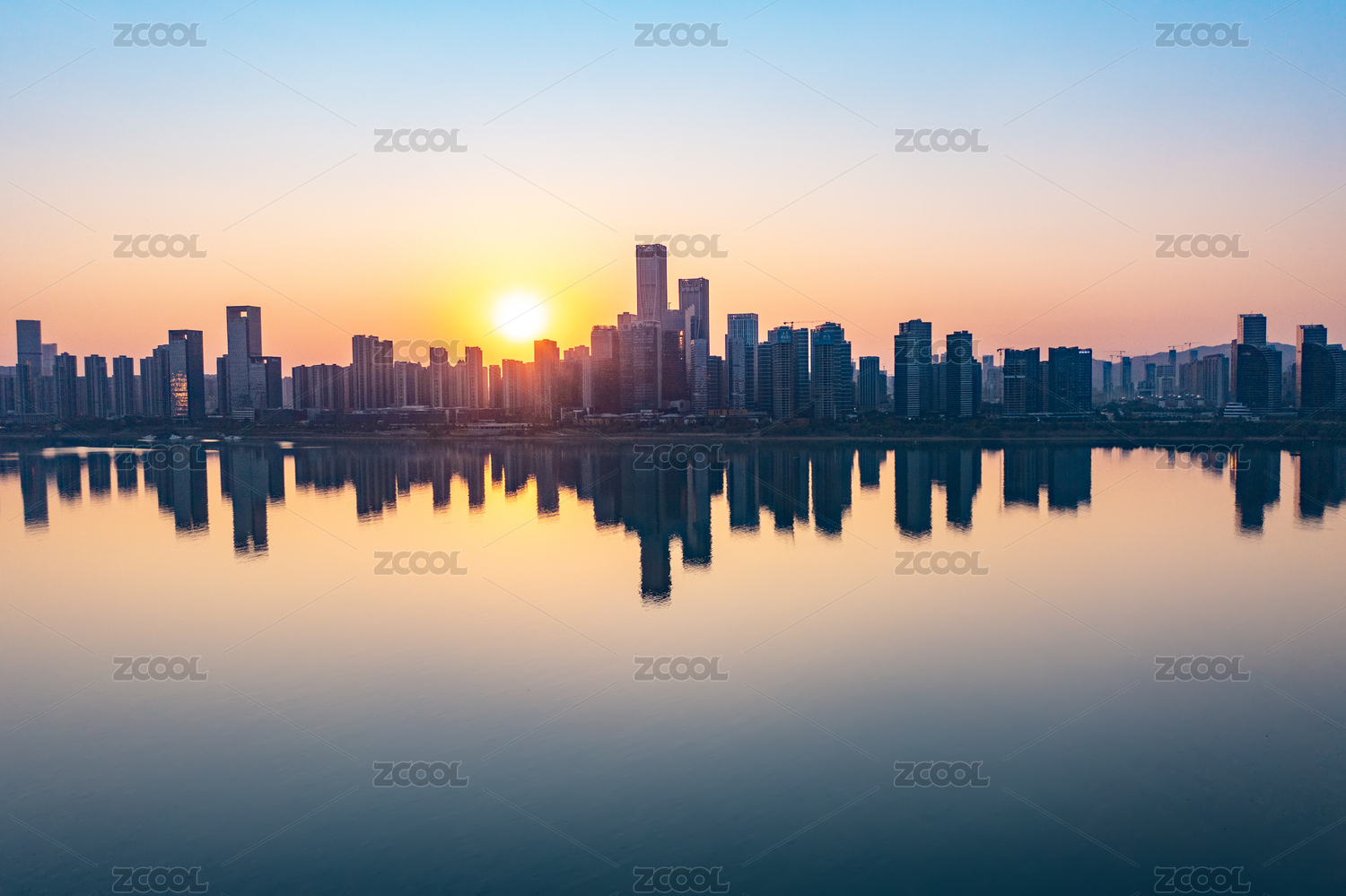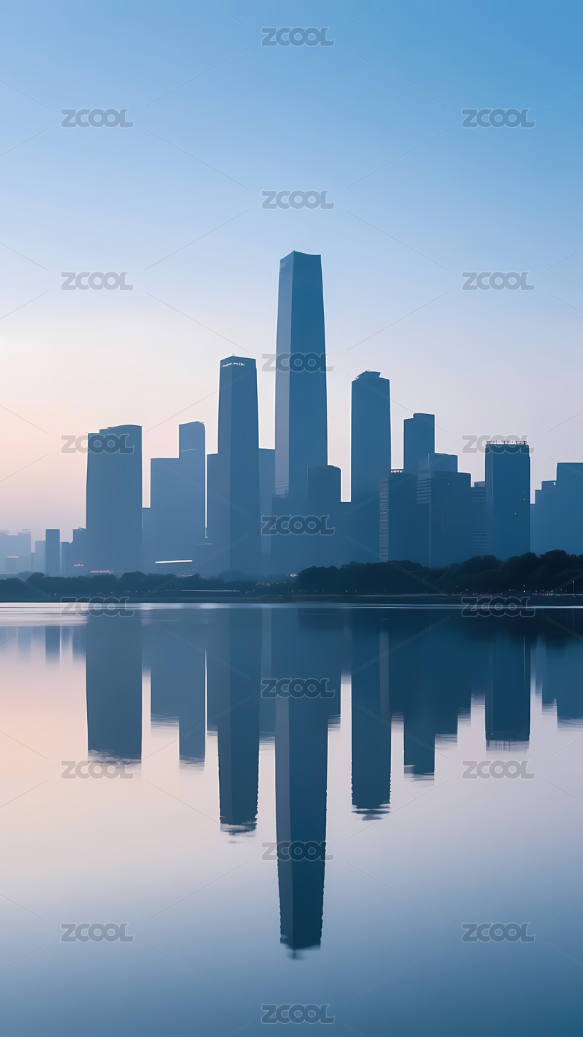 夕阳城市天际线倒影