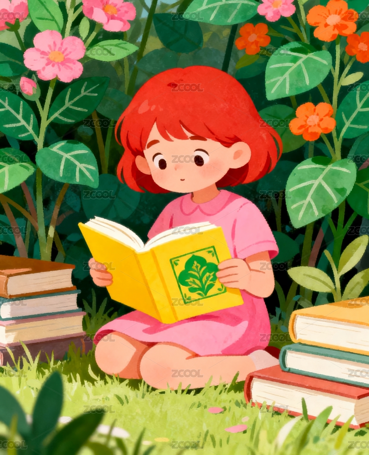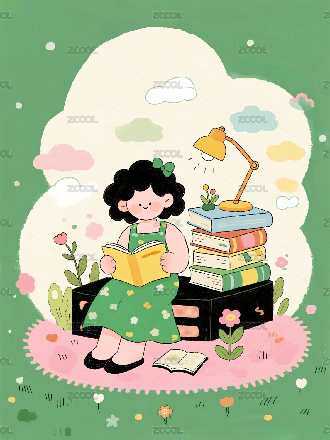 花朵,人物,艺术,插画,可爱,少女,设计,草地,卡通,绿色