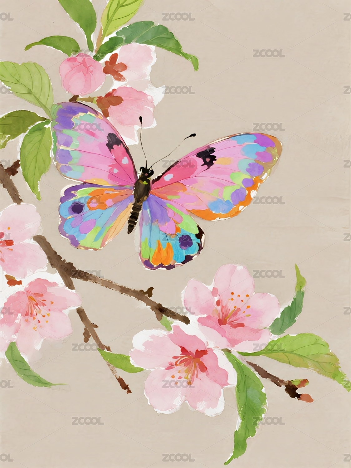 粉色花枝衬托下色彩斑斓的蝴蝶