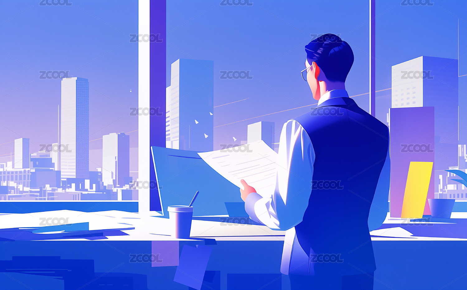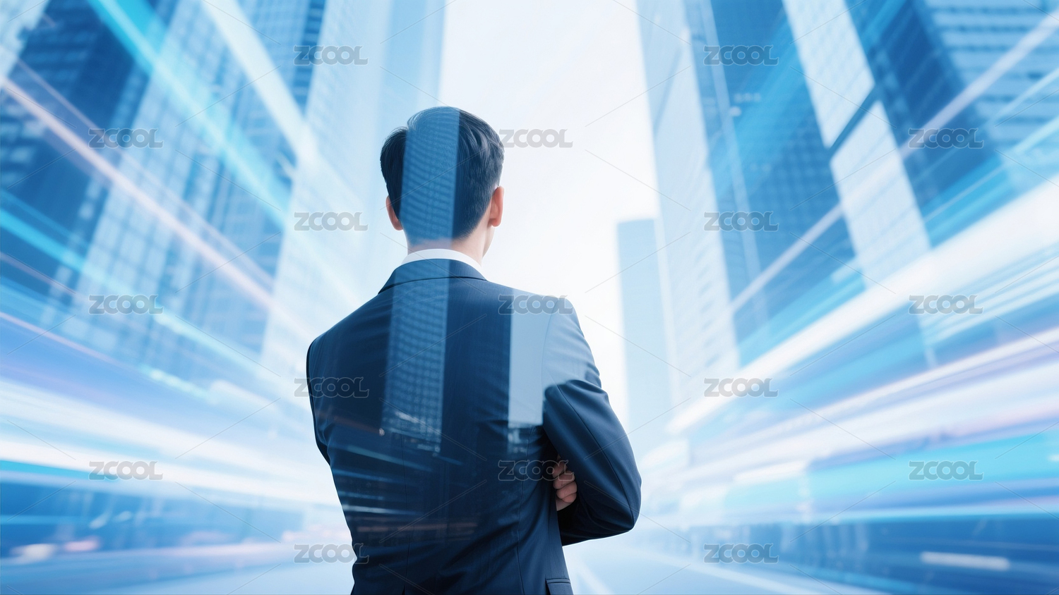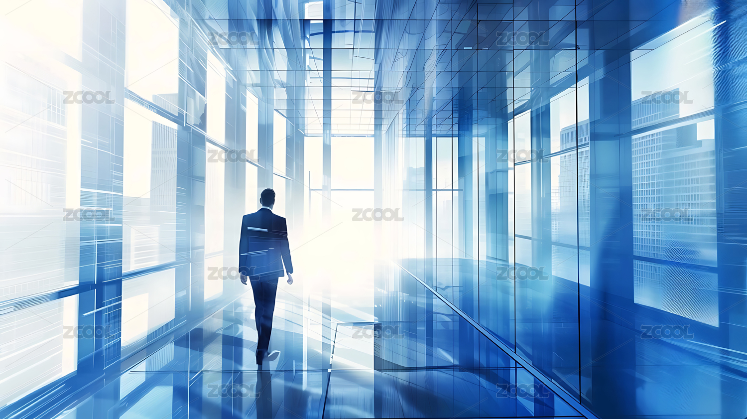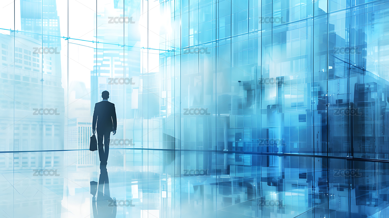 一位成功商业白领站在玻璃幕墙后边欣赏城市