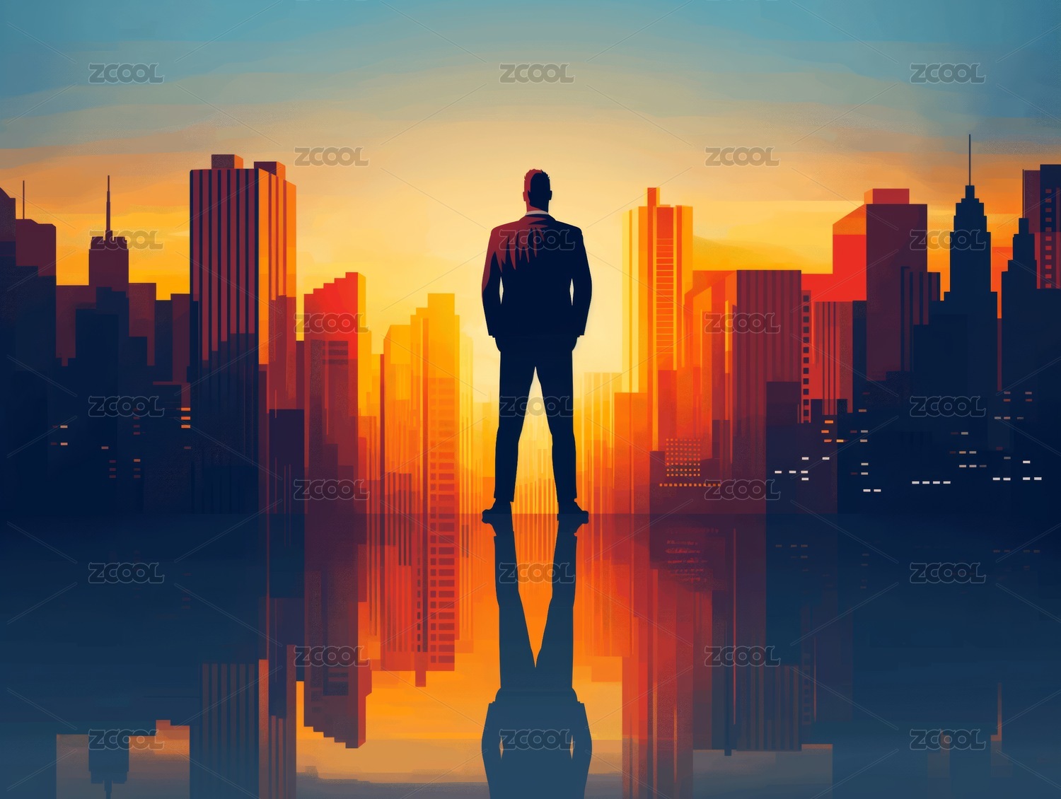 年轻商人站在透明玻璃顶楼遥望宏伟的城日出