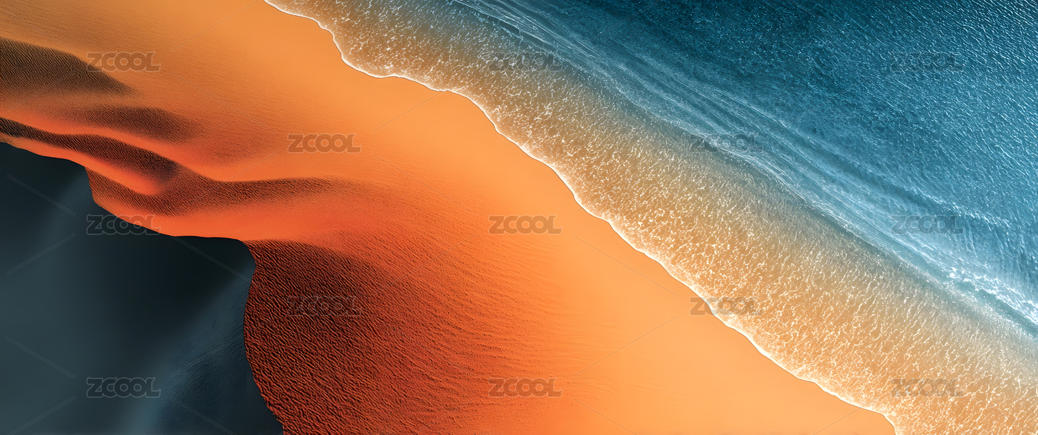 橙色沙滩与蓝色海浪交汇的海岸线