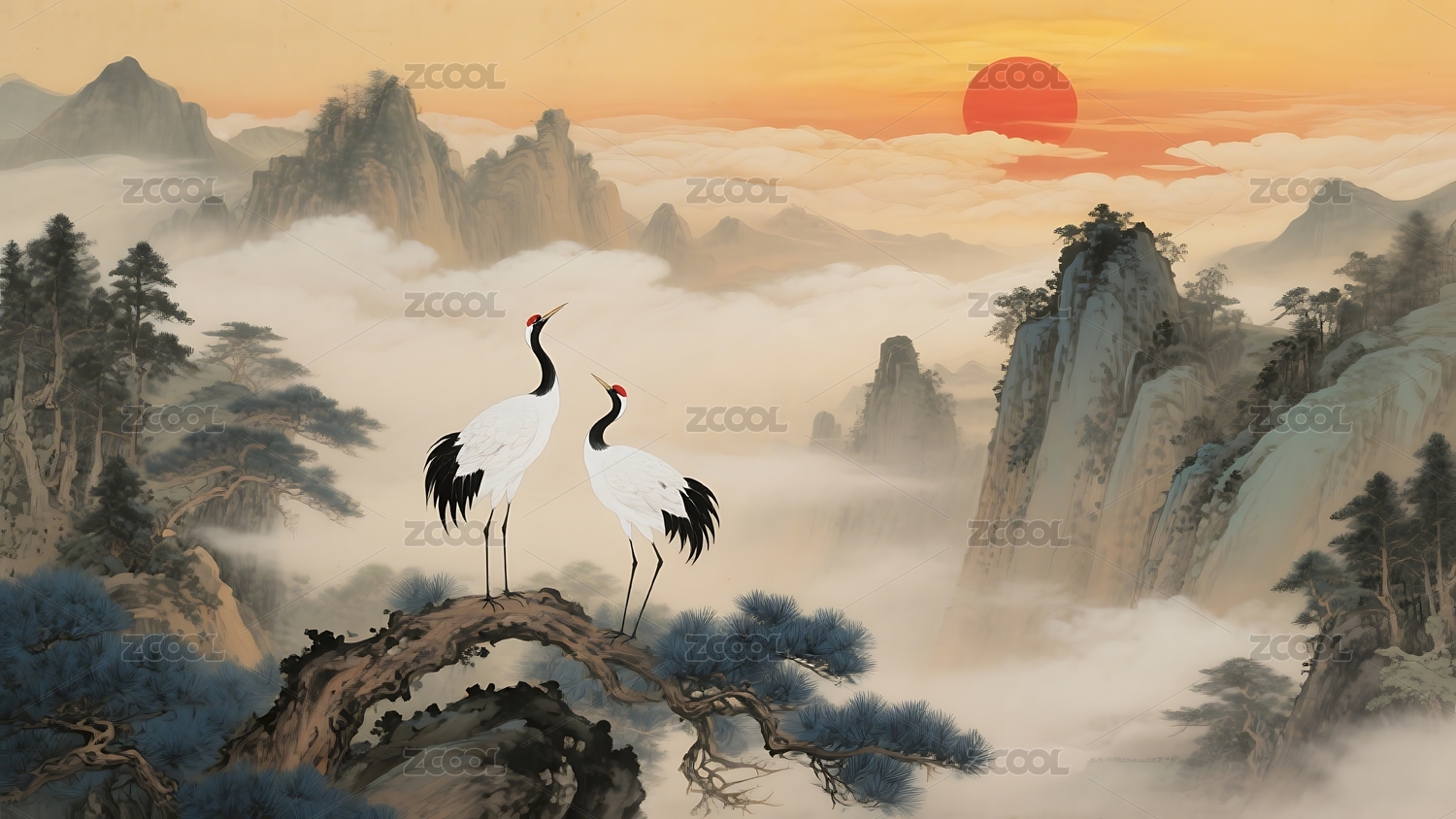 高山,仙鹤,丹顶鹤,节日,重阳节,灯光,插画,壁纸,水墨画,国潮
