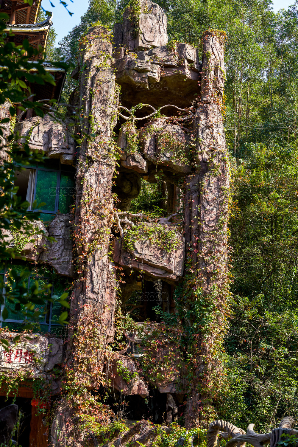 户外公园里假山石头建成的爬满爬山虎的建筑