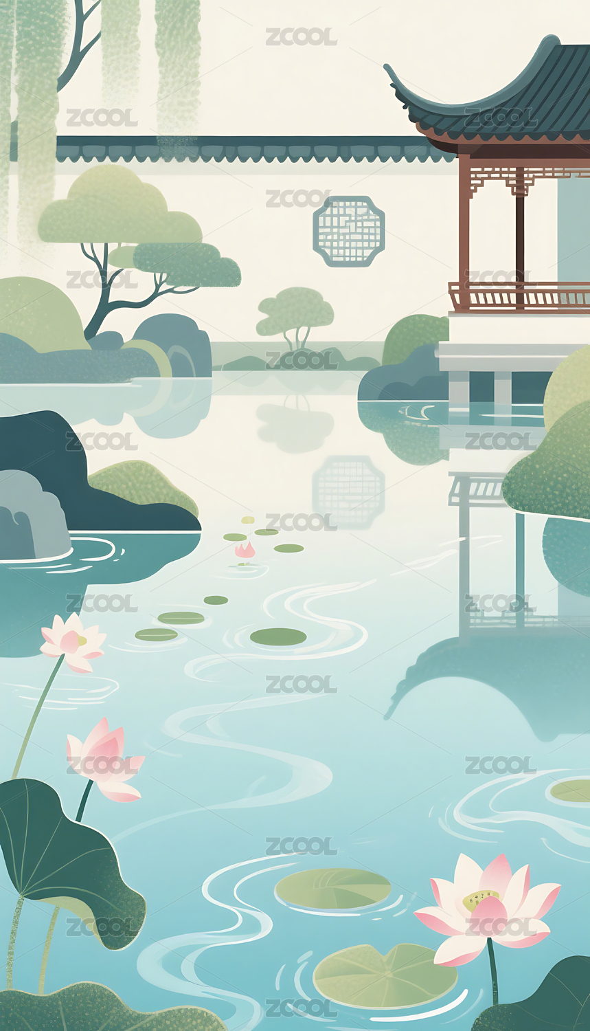 24节气插画夏天夏至池塘荷花荷叶凉亭
