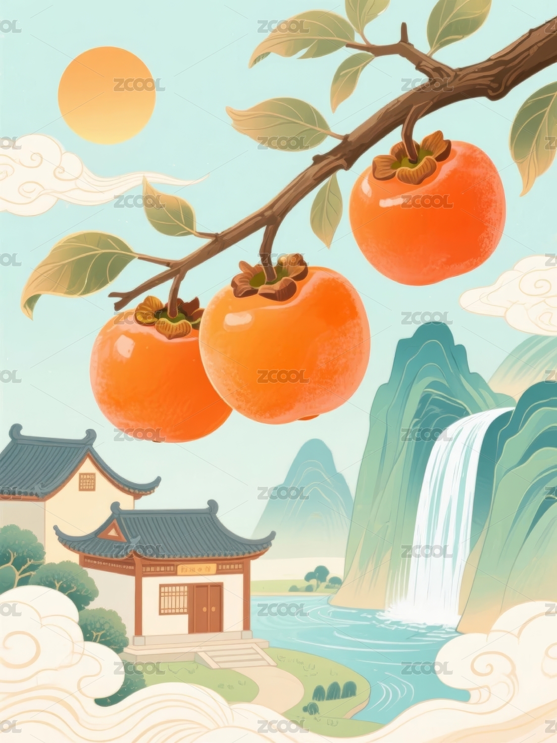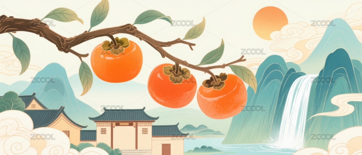 柿子枝头与山水古建筑