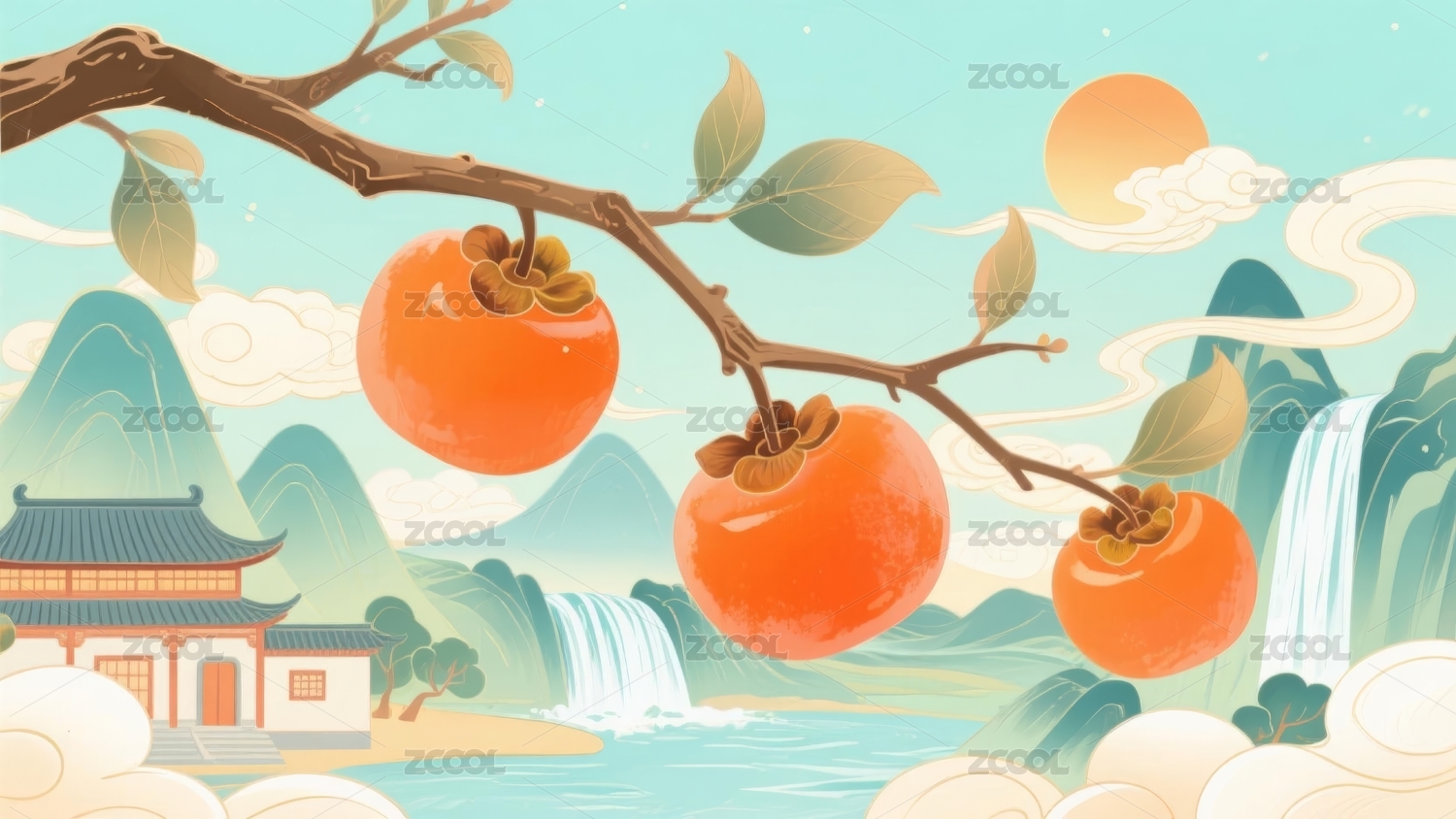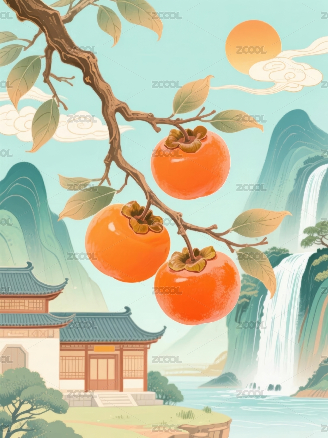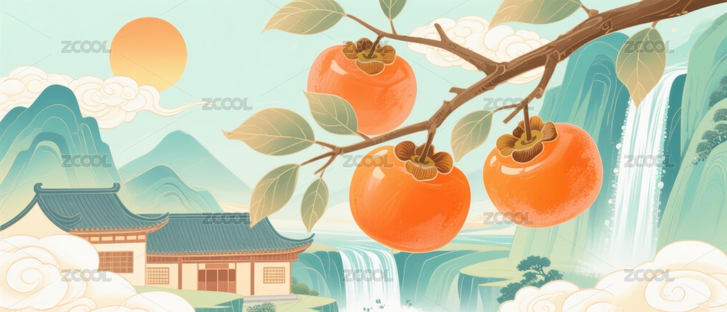 柿子国潮风山水建筑场景
