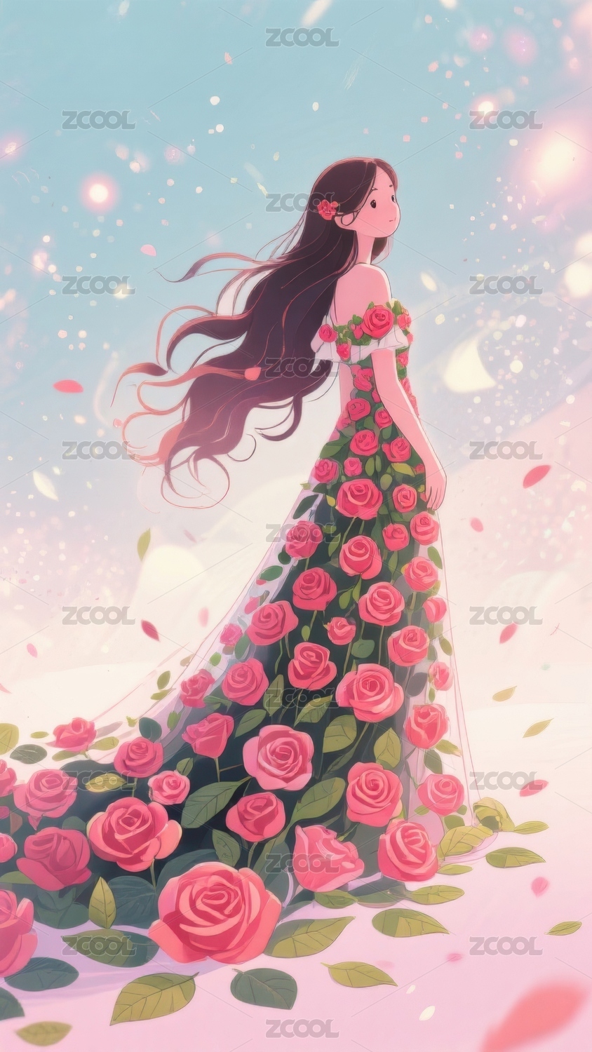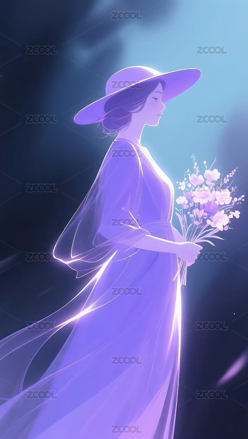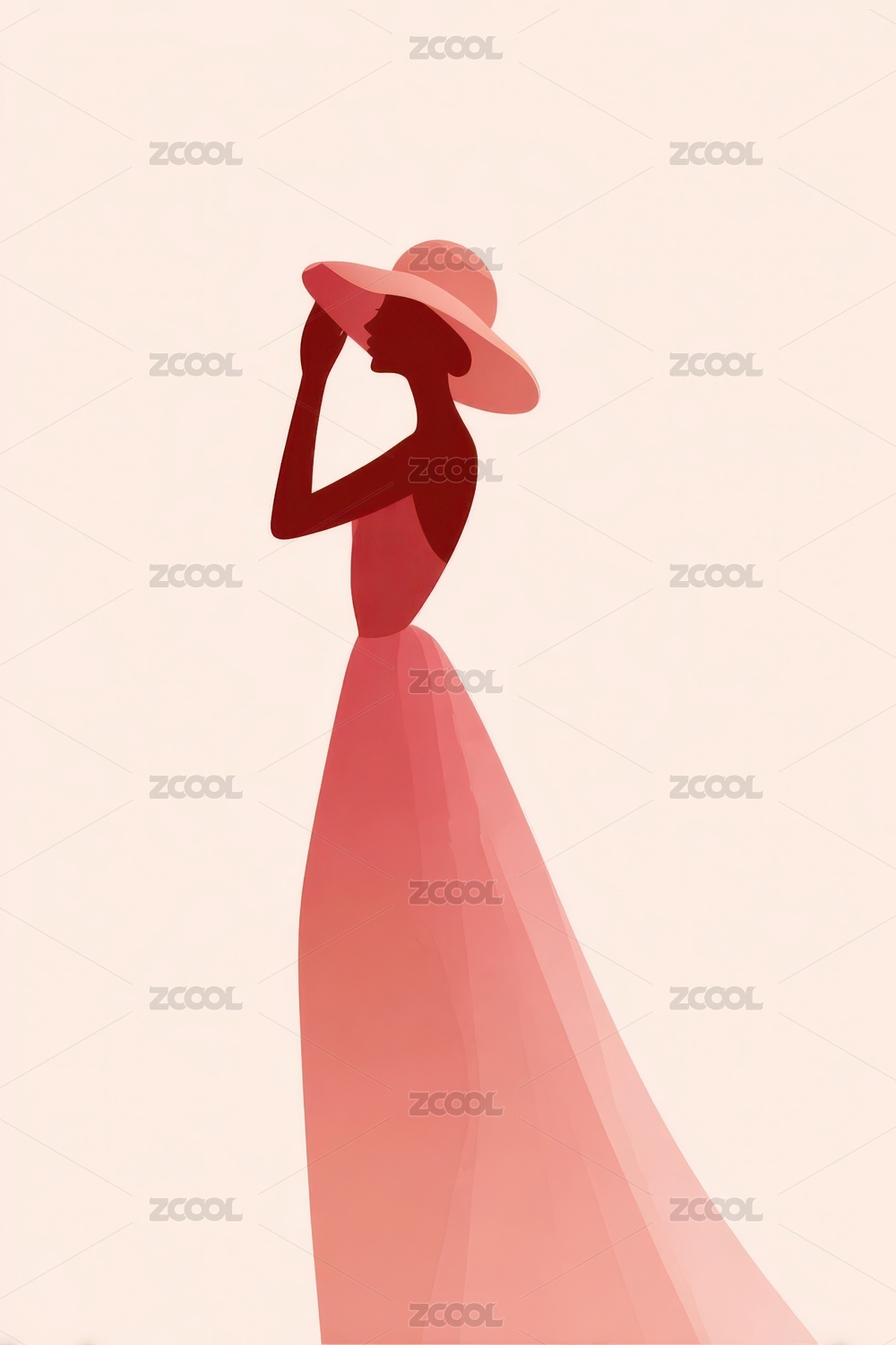 优雅女性身着粉色长裙与宽檐帽的侧影