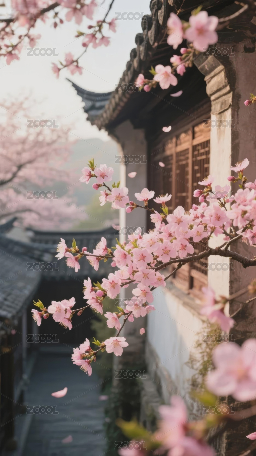 粉樱绽放古庭院春意盎然
