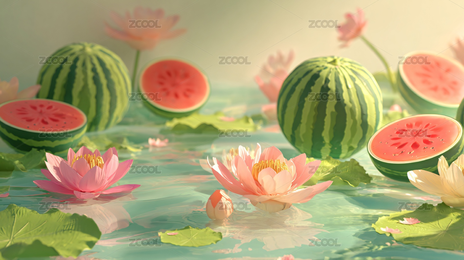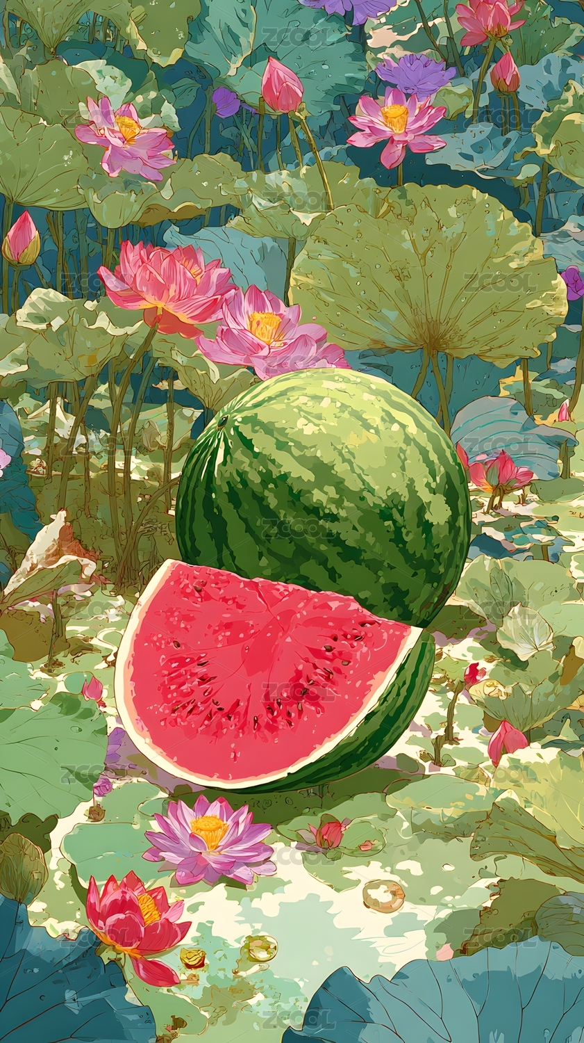 盛夏西瓜莲花图清新写实