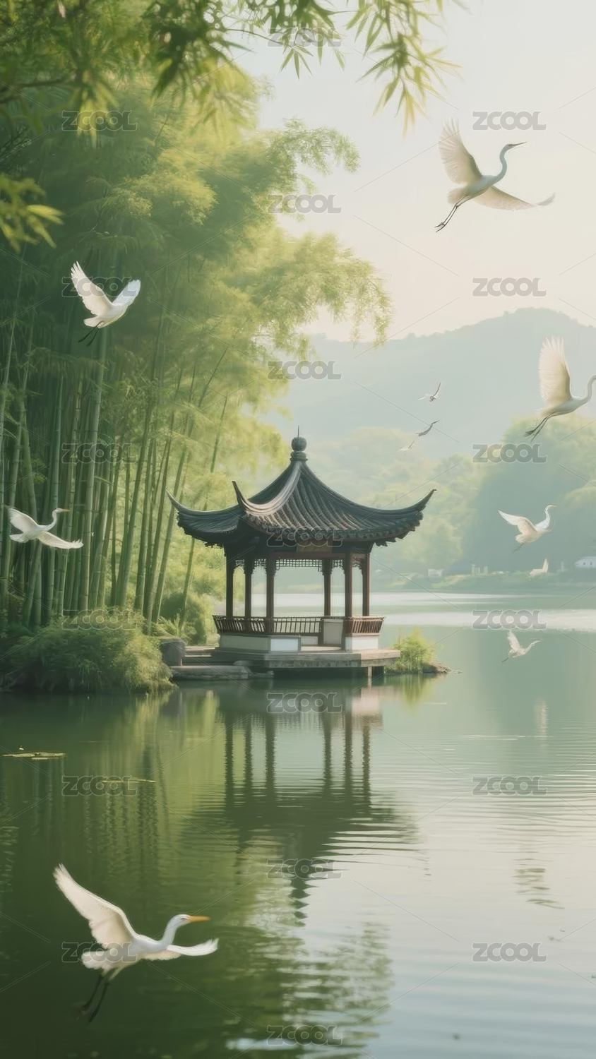 青绿亭子湖面竹林环绕