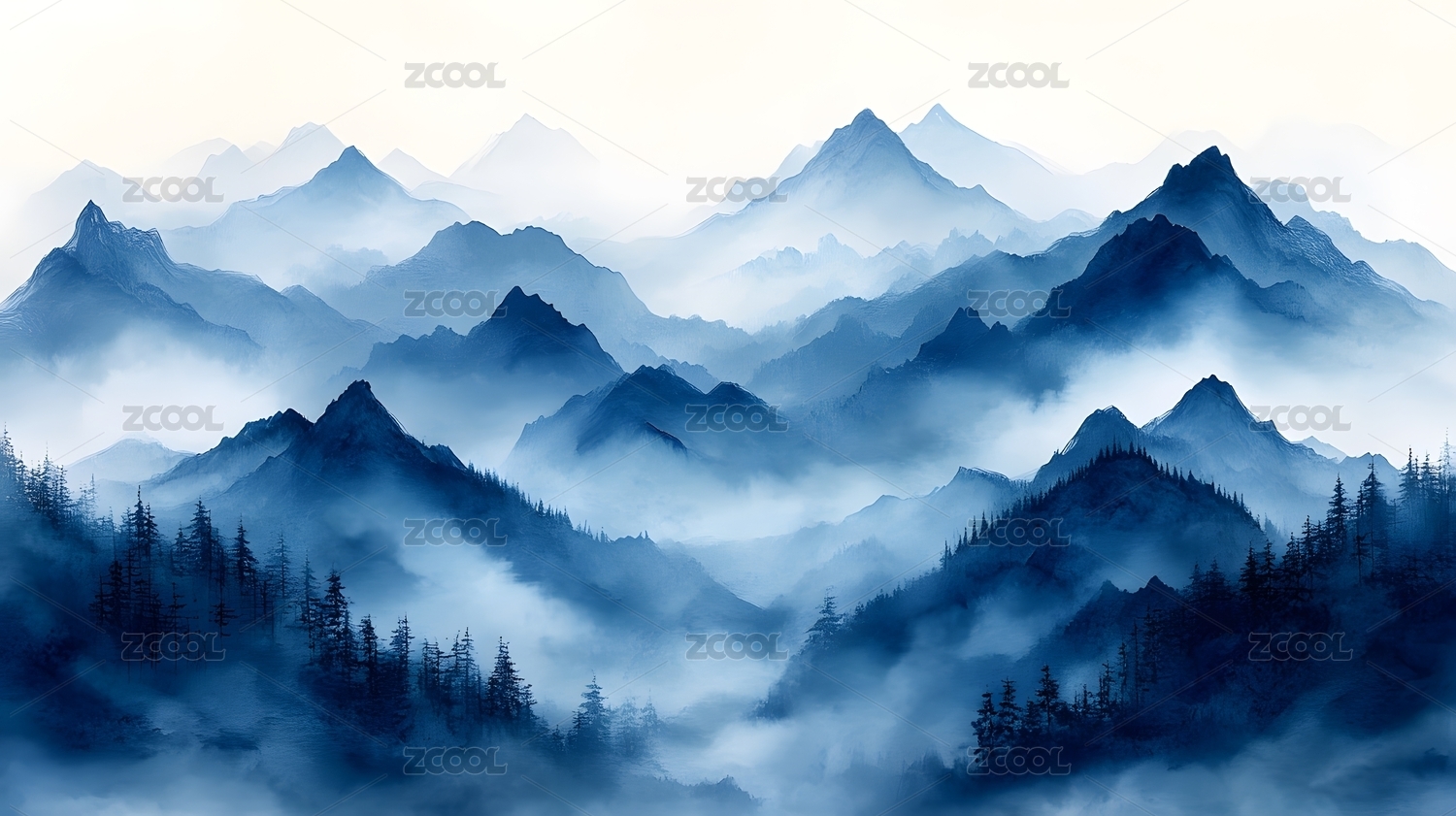 朦胧,静谧,唯美,意境,自然,水彩,清新,山峰,远山,云雾