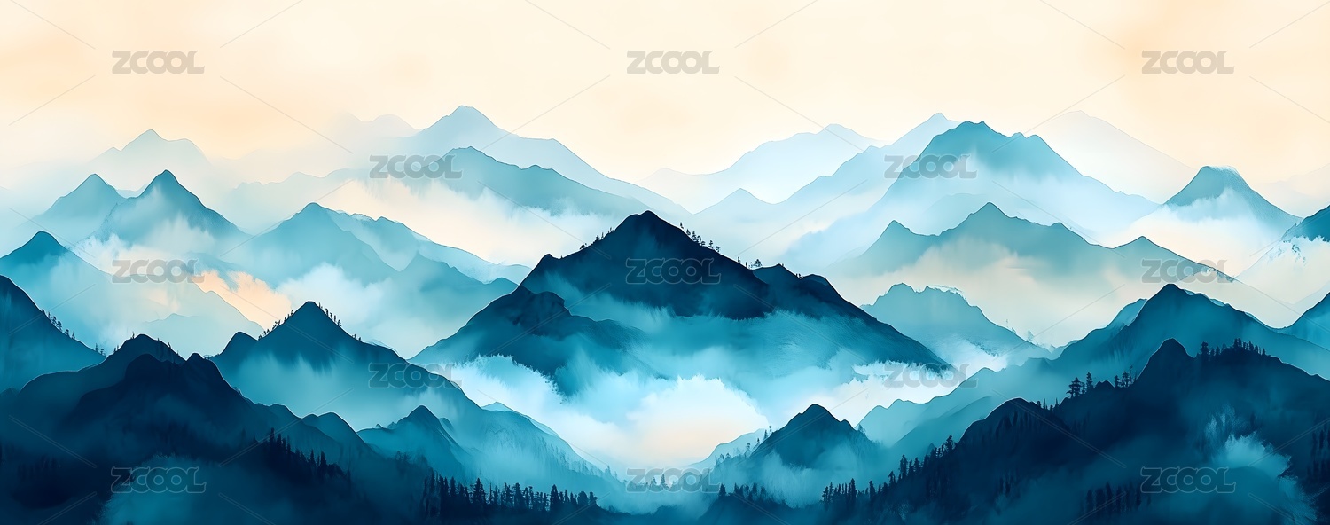 山峰云海水彩渲染 蔚蓝山河宁静祥和