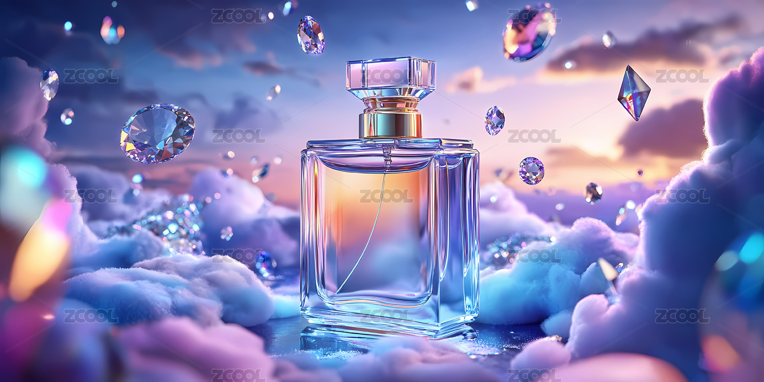 香水瓶置于梦幻云层与宝石之中
