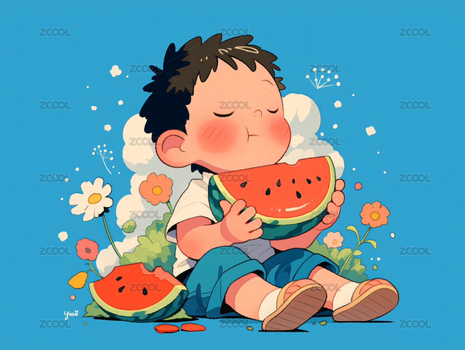 夏日里一个男孩坐在天台吃西瓜,夏季节气