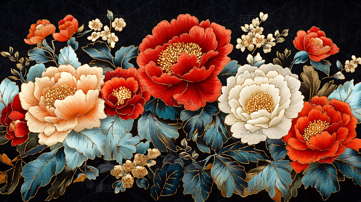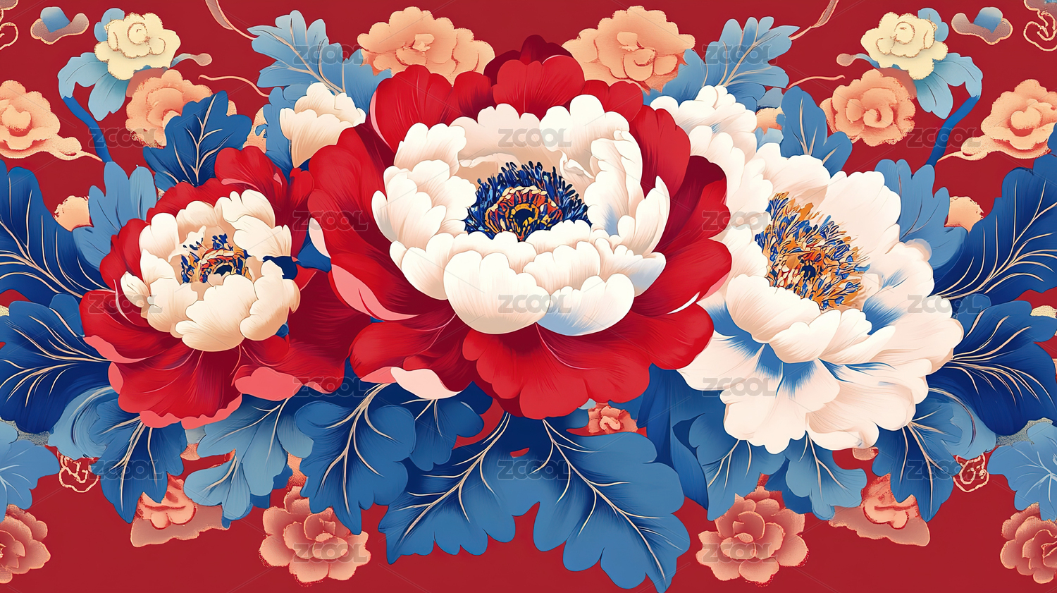 红牡丹簇拥在翠蓝底纹上绽放,优雅静谧
