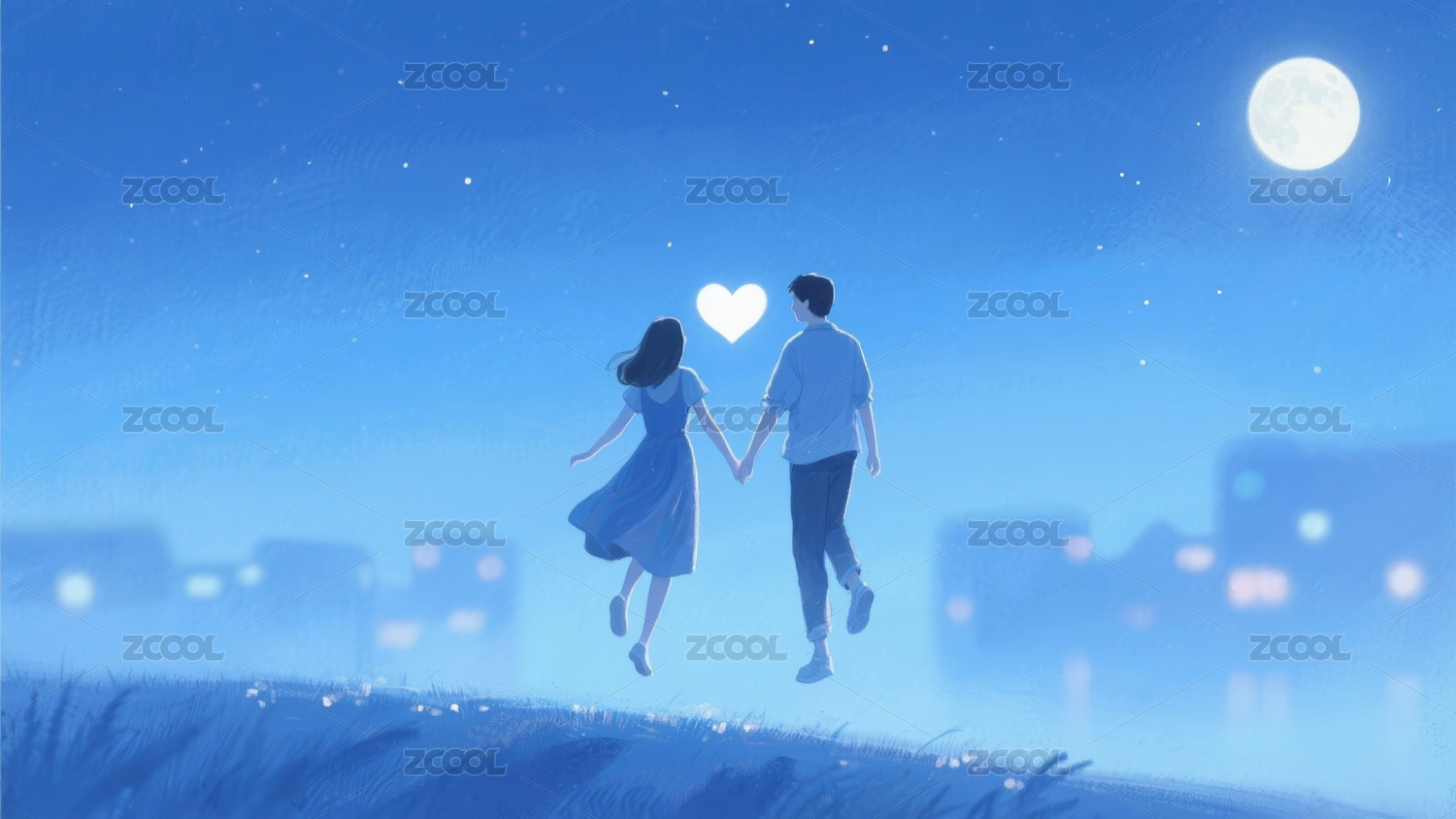月亮星空下步行的青年情侣背影温馨梦幻手绘插画