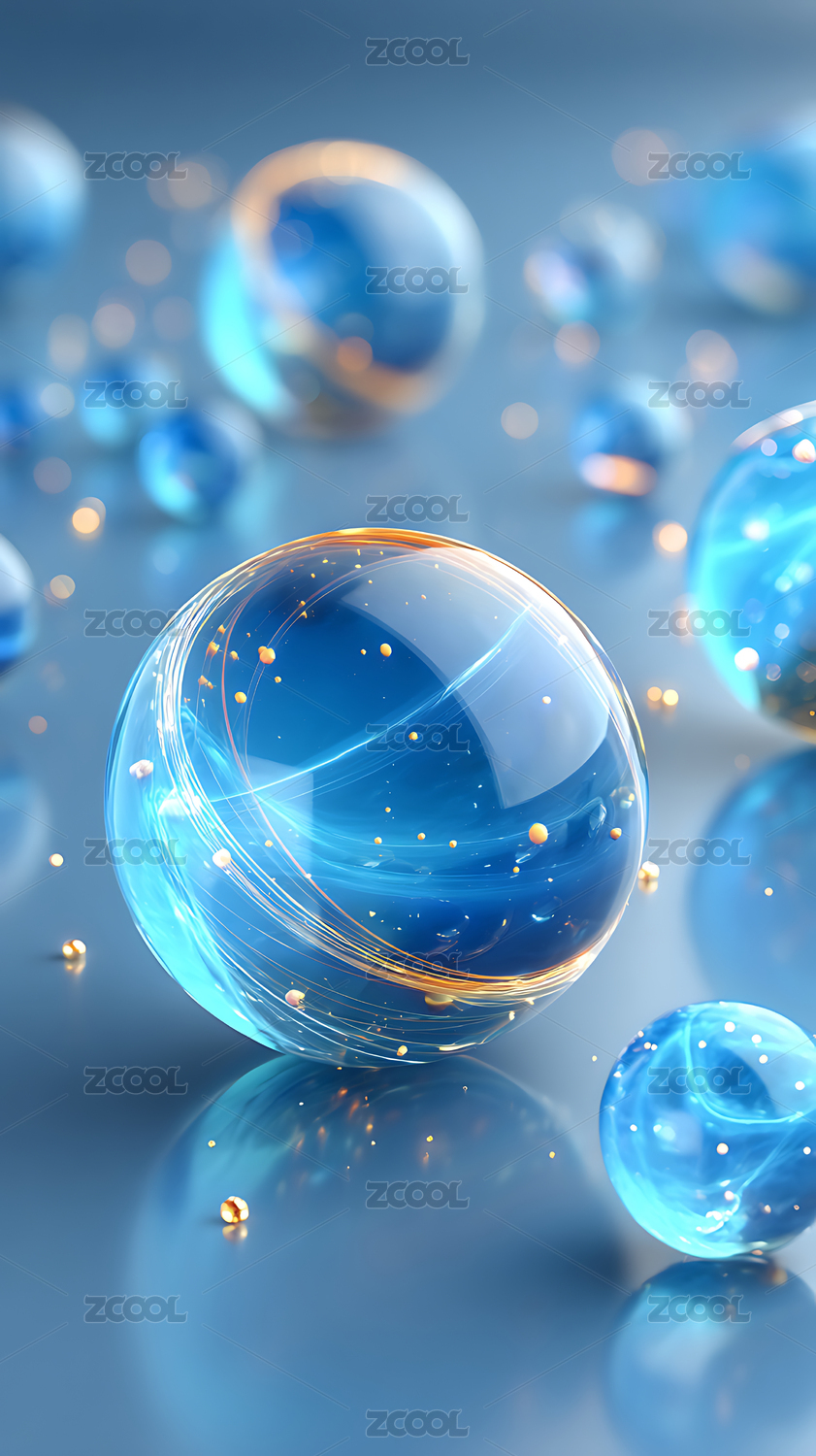 闪耀蓝色玻璃球与发光粒子的柔和光影