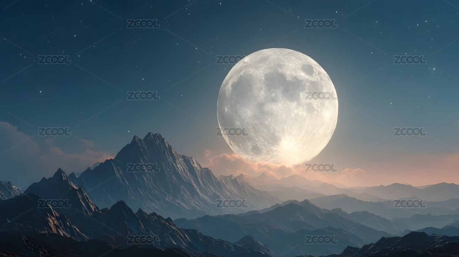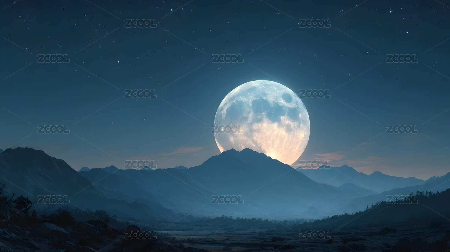 满月夜空映衬山脉景色